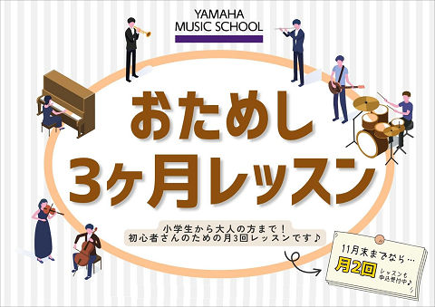 枚方店にて実施しているおためし3ヶ月レッスンのご紹介です♪おためし期間なので入会金・レッスン料に含まれる施設費の免除、自主練習の為のお部屋を無料利用いただける特典などがございます☆これからはじめたい方向けのオススメコースです!!