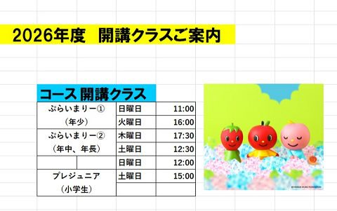 ‹ › × × おかやまセンター 2026年春の開講クラス入会受付中! お友達と楽しくレッスンに通っていたら、いつのまにか音が楽しめる毎日を送るようになっていた。そんな場所がヤマハ音楽教室です。 (続きは画像をクリック) 音楽を感じて、奏でて、自分の音で表現できる力をつけるヤマハ音楽教室、ぜひ体験お待ちしてます。 入口 JR学研都市線「忍ケ丘駅」降りてすぐにある、おかやまセンターです。バンベール忍ケ丘2Fにあるので、階段でお上がりください♪ぷっぷるがお待ちしております♪ 2026年度開講クラス 2026年度の開講クラスです。 只今、入会予約も受付中! 無料体験レッスンも実施しております。 まずは、気軽にお問合せください。 ピアノ・エレクトーン個人レッスン部屋 最新のヤマハエレクトーンステージア02Cでレッスンします。好きな曲を楽しく弾く方からコンクール参加や、ヤマハグレード受験など様々なニーズに合わせてレッスンします♪ グループレッスン部屋 ピアノ個人レッスン部屋 グランドピアノ使用のレッスン部屋は2部屋あります。 グループレッスン部屋 グループレッスンのレッスン風景です。 「らしくぴあの」生徒募集中♪ 幼児の方から大人の方までその方の希望に沿ったピアノレッスンのスタイルをご相談させていただきます。 まずは無料体験レッスンから 住所 〒575-0003 四條畷市岡山東2-1-27 バンベール忍ヶ丘2F 地図を見る アクセス 最寄駅 JR学研都市線 忍ヶ丘駅 徒歩1分 目印 駅前ロータリー お問い合わせ 072-877-0390受付時間等、詳細はこちら 体験レッスン・レッスン見学 お申し込み受付中!