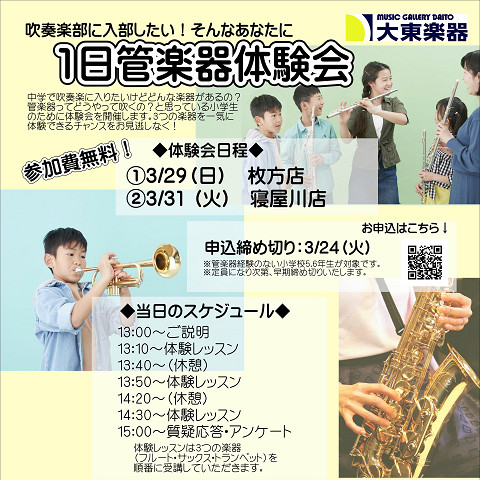 吹奏楽部に入部したい5・6年生対象【管楽器1日体験会】