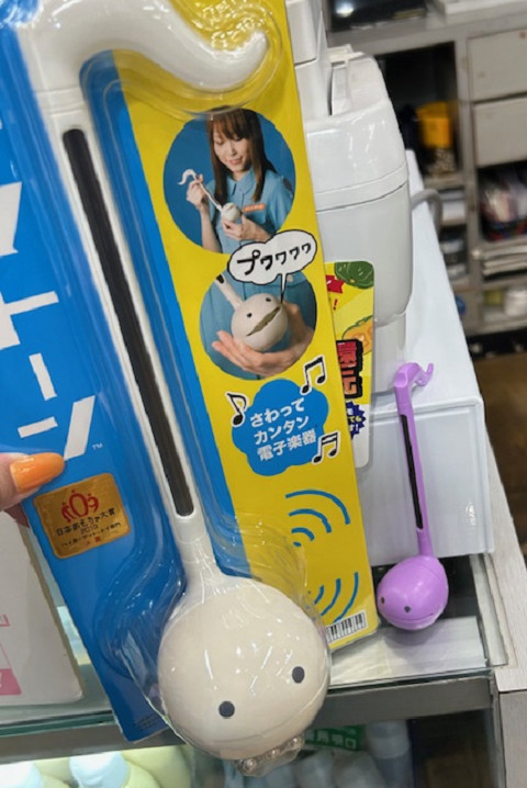 音符の形をした電子楽器で、片方の手で棒の部分を押さえ音程を決めて音を出し、もう片方の手で本体の下(顔の部分)を押して口をパクパク開き 音を変える、可愛くてユニークな楽器です☆