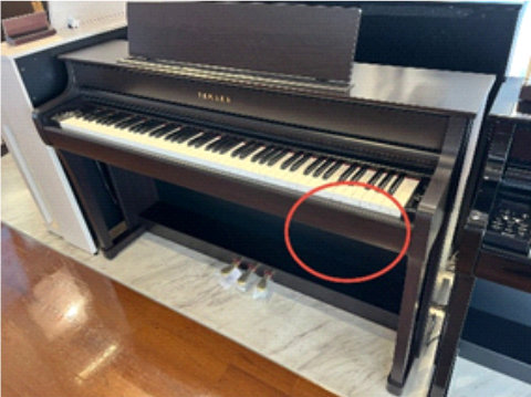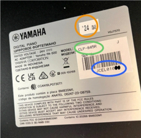 電話にて画像1の赤丸〇あたり、鍵盤裏側に画像2のようなステッカーをご覧いただき、