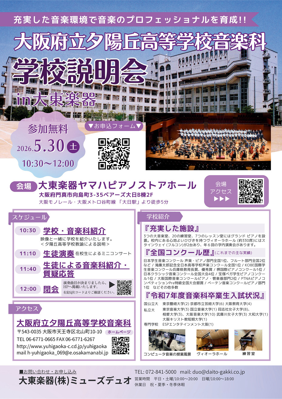 5/30(土) 大阪府立夕陽丘高等学校学校説明会 in 大東楽器 2026年3月6日 大東楽器音楽院、ミューズデュオ Web申し込み お問い合わせ・お申し込み ミューズデュオ TEL:072-841-5000 E-mail:duo@daito-gakki.co.jp