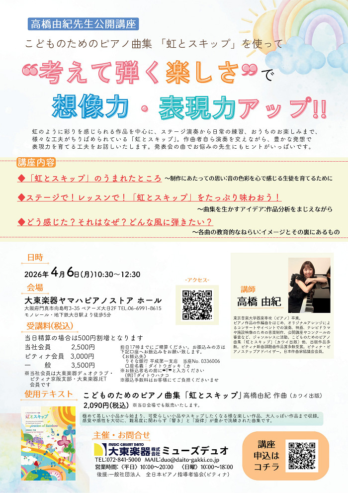 4/6(月) 高橋由紀先生公開講座「こどものためのピアノ曲集 「虹とスキップ」を使って❝考えて弾く楽しさ❞で想像力・表現力アップ!!」 2026年2月20日 大東楽器ヤマハピアノストア、ミューズデュオ お問い合わせ・お申し込み ミューズデュオ TEL:072-841-5000 E-mail:duo@daito-gakki.co.jp Web申し込み