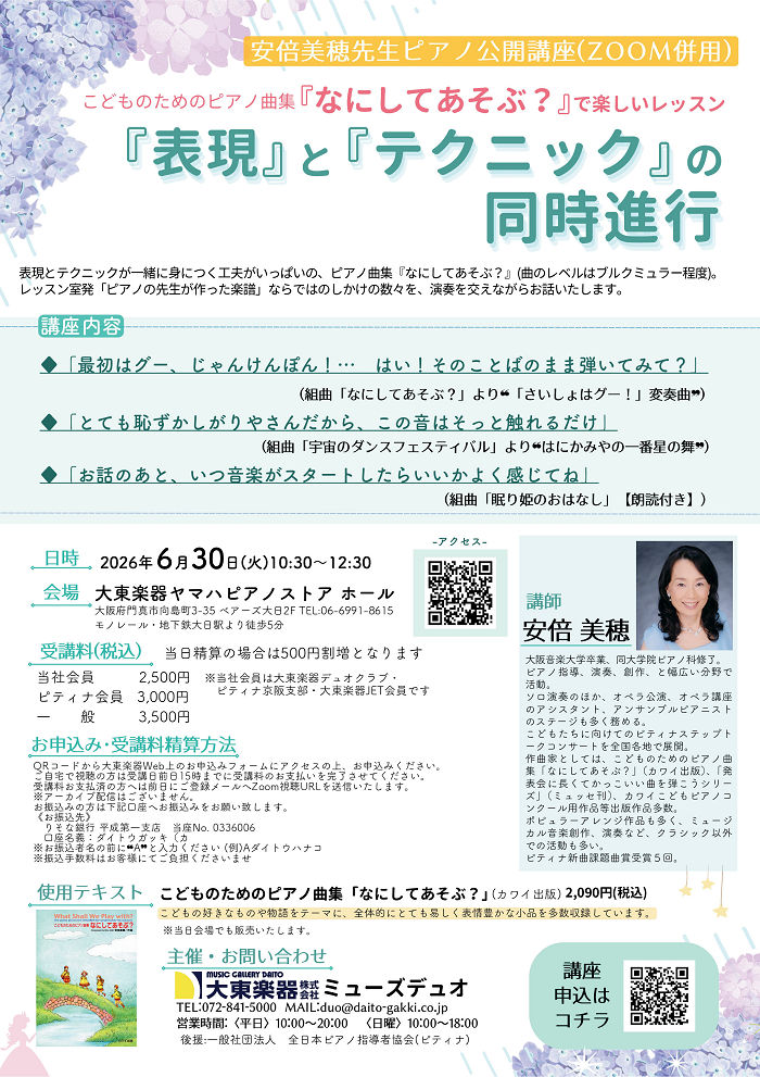 6/30(火) 安倍美穂先生公開講座(ZOOM併用)「こどものためのピアノ曲集 「なにしてあそぶ?」で楽しいレッスン『表現』と『テクニック』の同時進行」 2026年4月27日 大東楽器ヤマハピアノストア、ミューズデュオ お問い合わせ・お申し込み ミューズデュオ TEL:072-841-5000 E-mail:duo@daito-gakki.co.jp Web申し込み