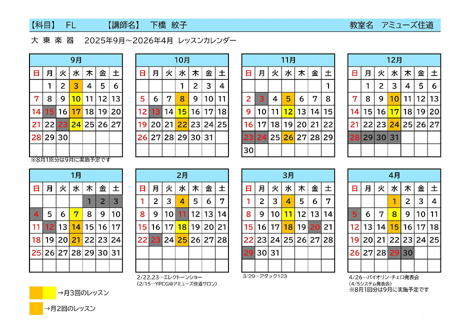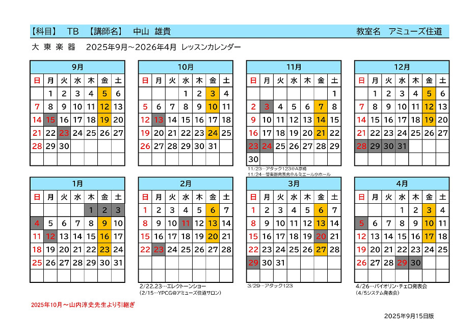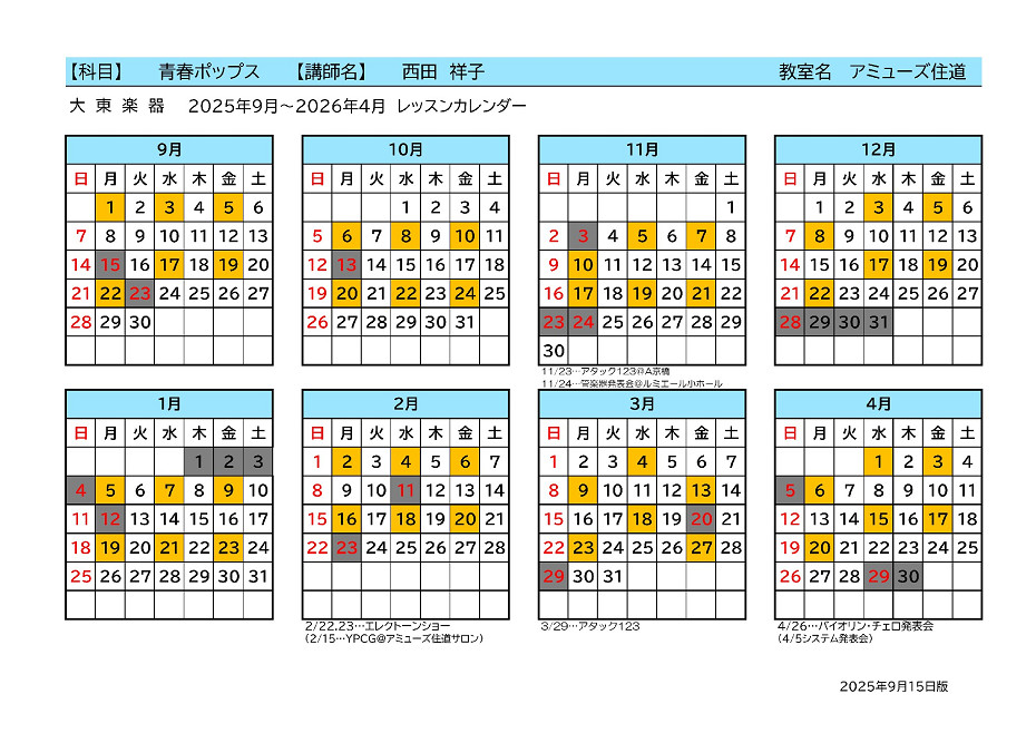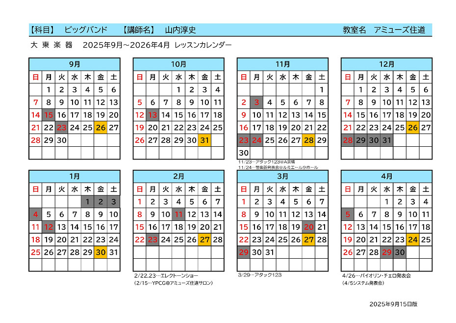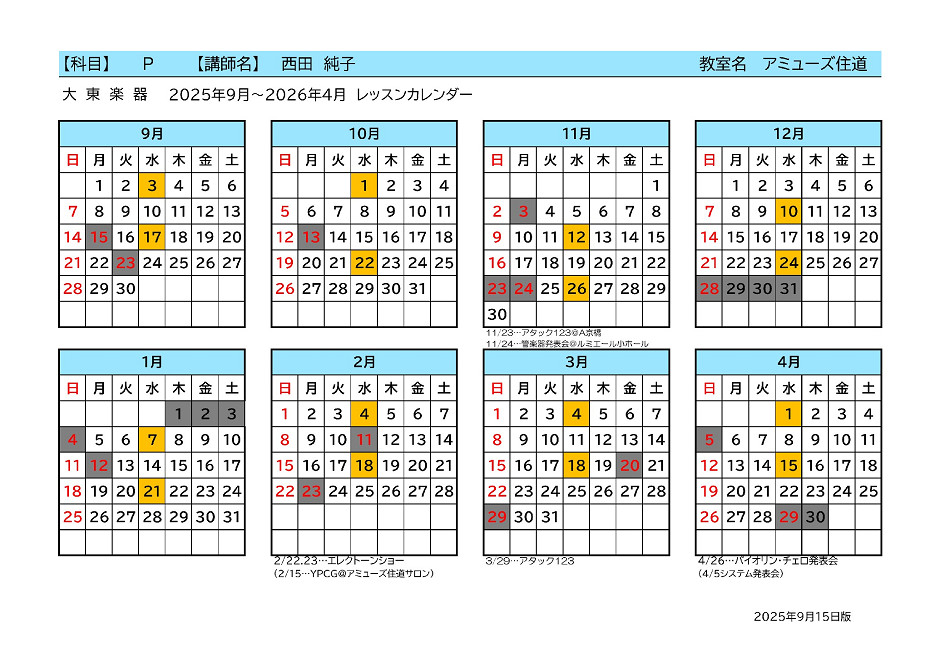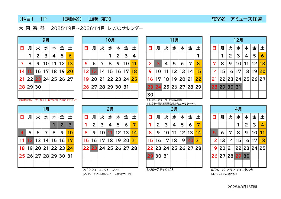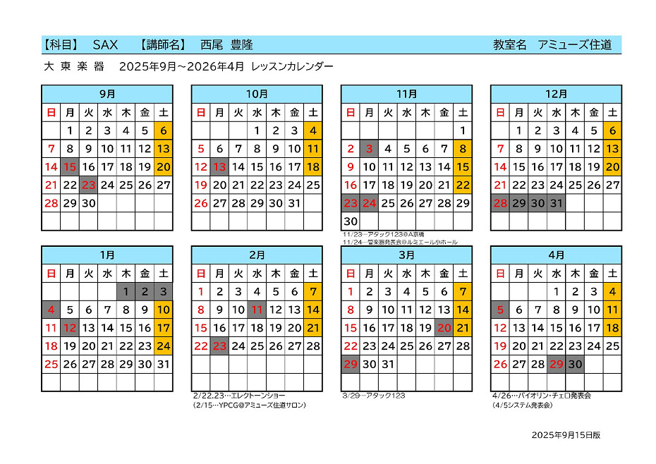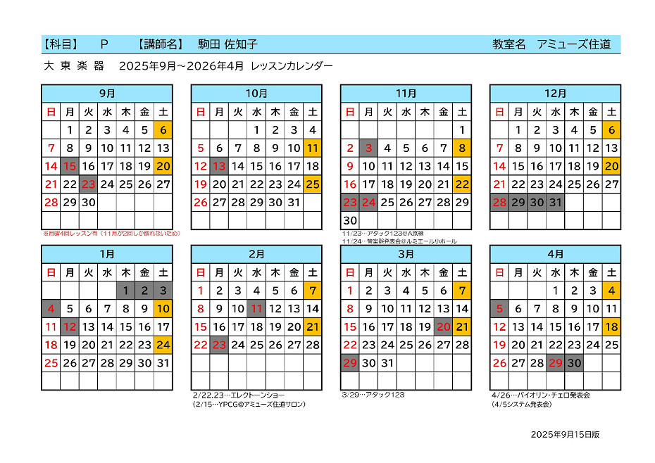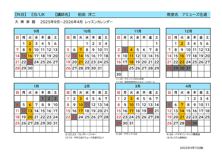 アミューズ住道レッスン日程 2024年10月5日 アミューズ住道 掲載日程と異なる生徒様については、講師よりご案内しておりますのでご注意ください。ご不明点がございましたら教室までお問い合わせください。 ギター・ベース・ウクレレ ドラム ボーカル・ゴスペル サックス・フルート・オカリナ トランペット・トロンボーン バイオリン・チェロ ピアノ・エレクトーン その他 ギター・ベース・ウクレレ 森川国彦 (月:ギター) 難波大介 (火・木・日:ギター・ウクレレ) 村上良 (水:ギター・ウクレレ) 岡森太郎 (木:ギター・ウクレレ) 長谷川和輝 (金:ギター・ウクレレ) 柴田信幸 (土:ギター・ウクレレ) 田路雄一 (土:ギター・ウクレレ) 前田洋二 (火:エレキベース・ウクレレ) 山田進人 (日:エレキベース・ウクレレ) 福山敦子 (木:クラシックギター) このページの上へ ドラム 鈴木正人 (月・木・土:ドラム) 井戸本勝裕 (火・水:ドラム) 守田未玖 (金:ドラム) 小川洋三 (土:ドラム) 植松波音 (日:ドラム) このページの上へ ボーカル・ゴスペル 立花さゆり (月:ボーカル) 阪下夏美 (金:ボーカル) 西田祥子 (月・火・木・土:ボーカル) 西田祥子 (土・日:ゴスペル) このページの上へ サックス・フルート・オカリナ 徳永秀峰 (火:サックス) 笹岡志帆 (水:サックス) 黒川正治 (木:サックス) 小川欽司郎 (金:サックス) 西尾豊隆 (土:サックス) 佐藤友香(日:サックス) 下橋紋子 (水:フルート・オカリナ) このページの上へ トランペット・トロンボーン 石井茜 (火:トランペット) 山﨑友加 (土:トランペット) 中川雄貴 (金:トロンボーン) このページの上へ バイオリン・チェロ 栗山明弓 (水:バイオリン) 辻本馨 (木:バイオリン) 大津さゆり (金:バイオリン) このページの上へ ピアノ・エレクトーン 乗友美智子 (月・木:ピアノ・エレクトーン・健康と音楽) 岸本裕子 (月・金・土:ピアノ) 山添雅子 (火:ピアノ) 西田純子 (水:ピアノ) 足立由美子 (金:ピアノ) 駒田佐知子(土:ピアノ) 西田祥子 (月・木・金・土:エレクトーン) 安田直子 (月・火・水・土・日:エレクトーン) 中島千栄子 (火・金・土・日:エレクトーン) 吉岡幸子 (水・木・土:エレクトーン) このページの上へ その他 西田祥子 (月・水・金:青春ポップス) 乗友美智子 (月・木:ピアノ・エレクトーン・健康と音楽) 吉岡寛子 (月・木:大正琴) 山内淳史講師 (ビックバンド) このページの上へ お問い合わせ アミューズ住道 TEL:072-874-0086 E-mail:amuse-sumi@daito-gakki.co.jp