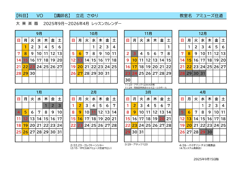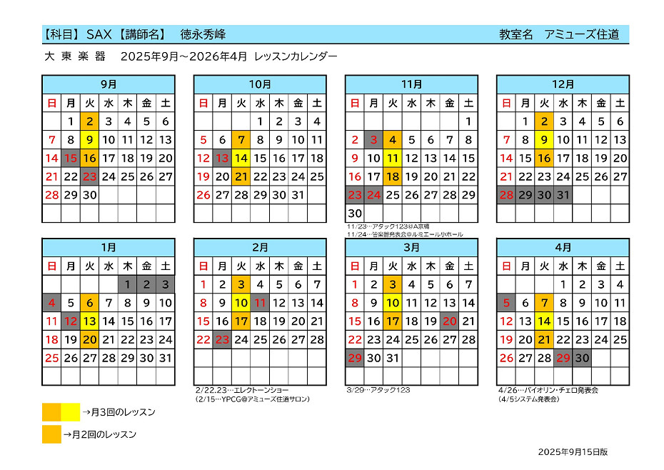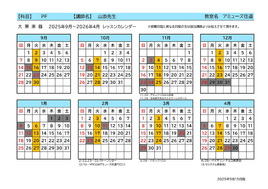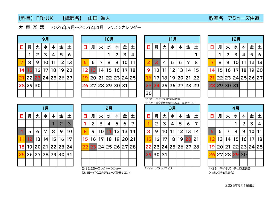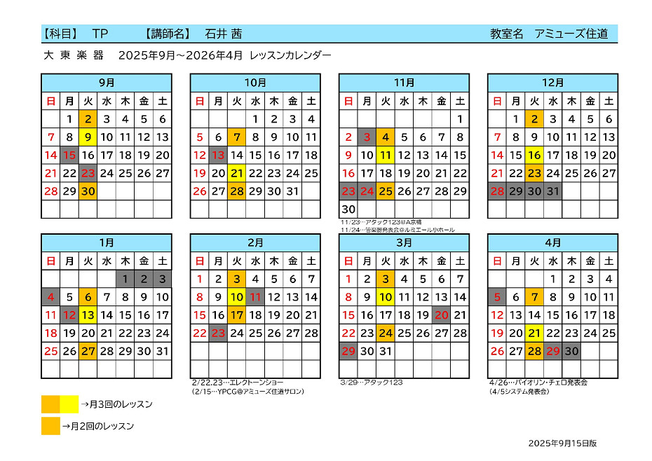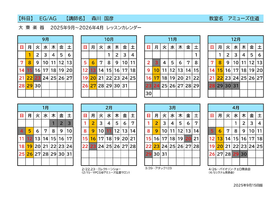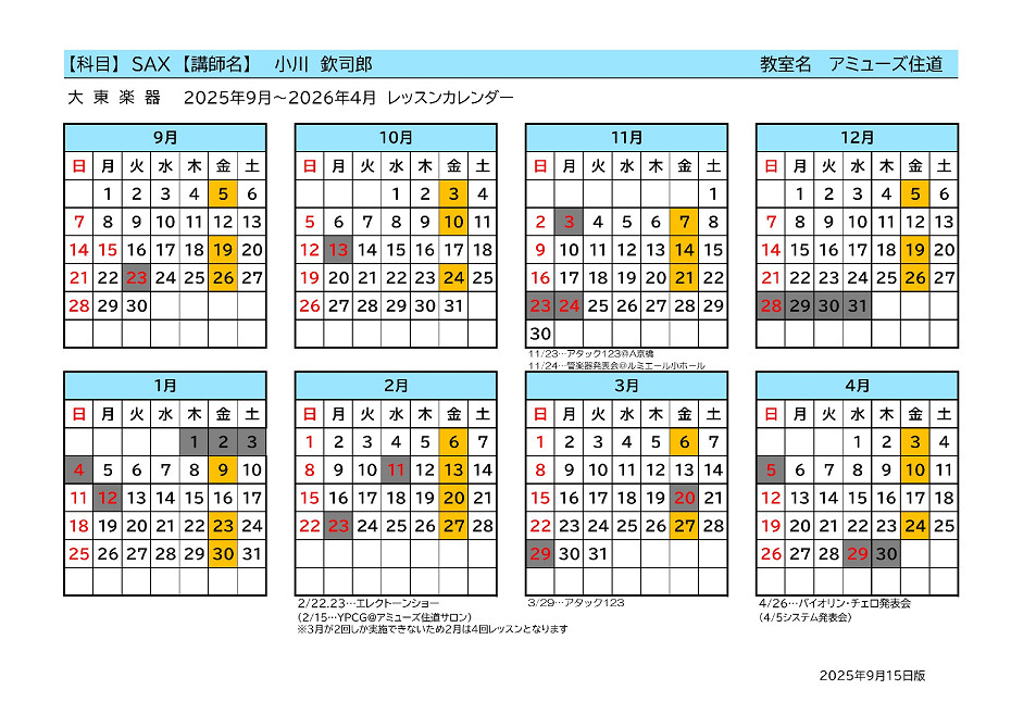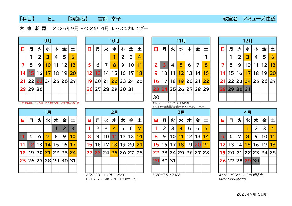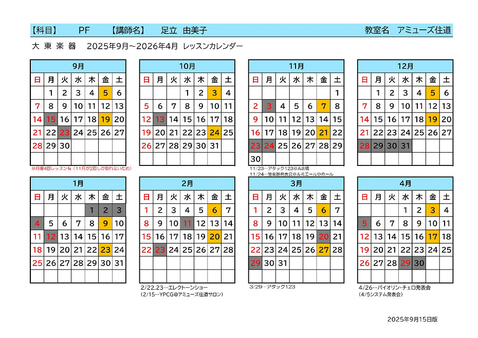 アミューズ住道レッスン日程 2024年10月5日 アミューズ住道 掲載日程と異なる生徒様については、講師よりご案内しておりますのでご注意ください。ご不明点がございましたら教室までお問い合わせください。 ギター・ベース・ウクレレ ドラム ボーカル・ゴスペル サックス・フルート・オカリナ トランペット・トロンボーン バイオリン・チェロ ピアノ・エレクトーン その他 ギター・ベース・ウクレレ 森川国彦 (月:ギター) 難波大介 (火・木・日:ギター・ウクレレ) 村上良 (水:ギター・ウクレレ) 岡森太郎 (木:ギター・ウクレレ) 長谷川和輝 (金:ギター・ウクレレ) 柴田信幸 (土:ギター・ウクレレ) 田路雄一 (土:ギター・ウクレレ) 前田洋二 (火:エレキベース・ウクレレ) 山田進人 (日:エレキベース・ウクレレ) 福山敦子 (木:クラシックギター) このページの上へ ドラム 鈴木正人 (月・木・土:ドラム) 井戸本勝裕 (火・水:ドラム) 守田未玖 (金:ドラム) 小川洋三 (土:ドラム) 植松波音 (日:ドラム) このページの上へ ボーカル・ゴスペル 立花さゆり (月:ボーカル) 阪下夏美 (金:ボーカル) 西田祥子 (月・火・木・土:ボーカル) 西田祥子 (土・日:ゴスペル) このページの上へ サックス・フルート・オカリナ 徳永秀峰 (火:サックス) 笹岡志帆 (水:サックス) 黒川正治 (木:サックス) 小川欽司郎 (金:サックス) 西尾豊隆 (土:サックス) 佐藤友香(日:サックス) 下橋紋子 (水:フルート・オカリナ) このページの上へ トランペット・トロンボーン 石井茜 (火:トランペット) 山﨑友加 (土:トランペット) 中川雄貴 (金:トロンボーン) このページの上へ バイオリン・チェロ 栗山明弓 (水:バイオリン) 辻本馨 (木:バイオリン) 大津さゆり (金:バイオリン) このページの上へ ピアノ・エレクトーン 乗友美智子 (月・木:ピアノ・エレクトーン・健康と音楽) 岸本裕子 (月・金・土:ピアノ) 山添雅子 (火:ピアノ) 西田純子 (水:ピアノ) 足立由美子 (金:ピアノ) 駒田佐知子(土:ピアノ) 西田祥子 (月・木・金・土:エレクトーン) 安田直子 (月・火・水・土・日:エレクトーン) 中島千栄子 (火・金・土・日:エレクトーン) 吉岡幸子 (水・木・土:エレクトーン) このページの上へ その他 西田祥子 (月・水・金:青春ポップス) 乗友美智子 (月・木:ピアノ・エレクトーン・健康と音楽) 吉岡寛子 (月・木:大正琴) 山内淳史講師 (ビックバンド) このページの上へ お問い合わせ アミューズ住道 TEL:072-874-0086 E-mail:amuse-sumi@daito-gakki.co.jp