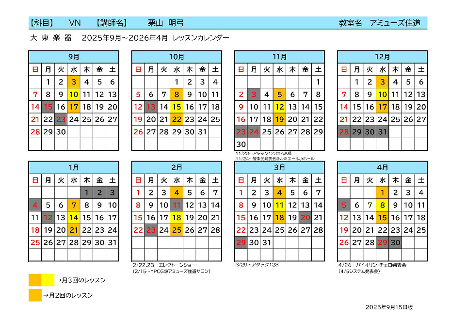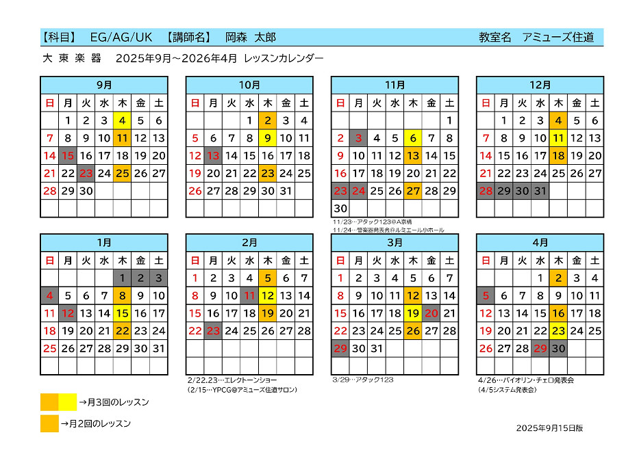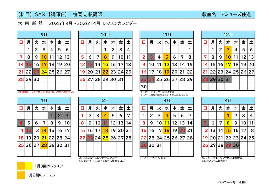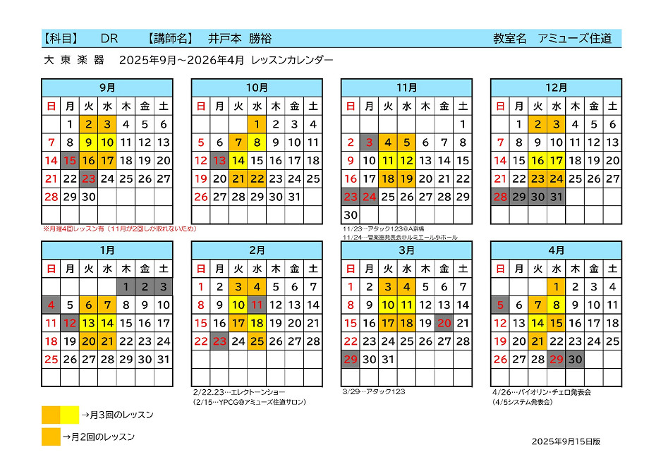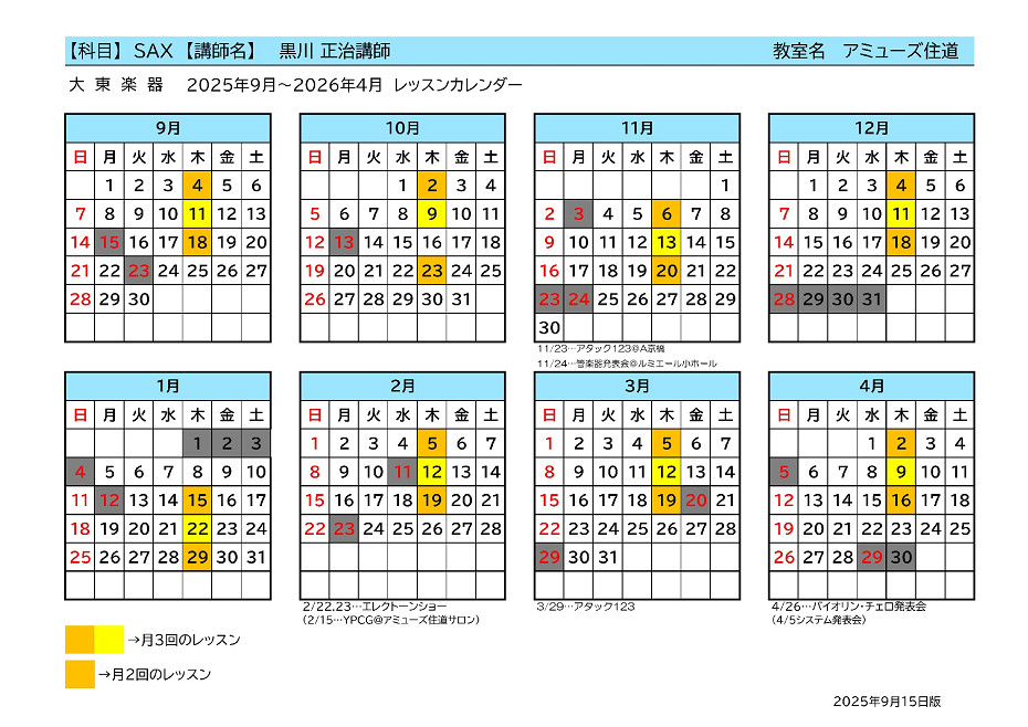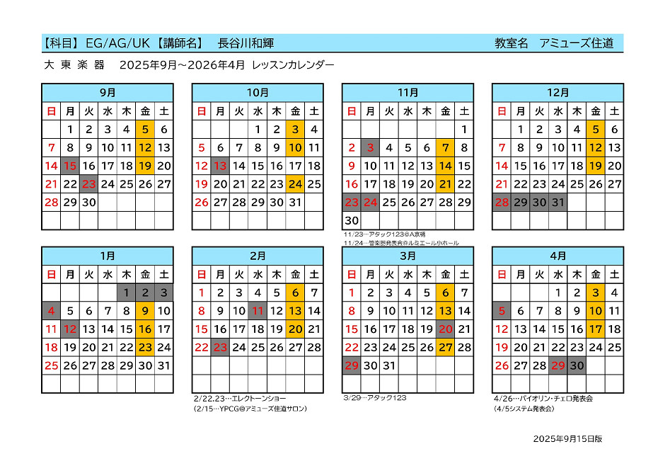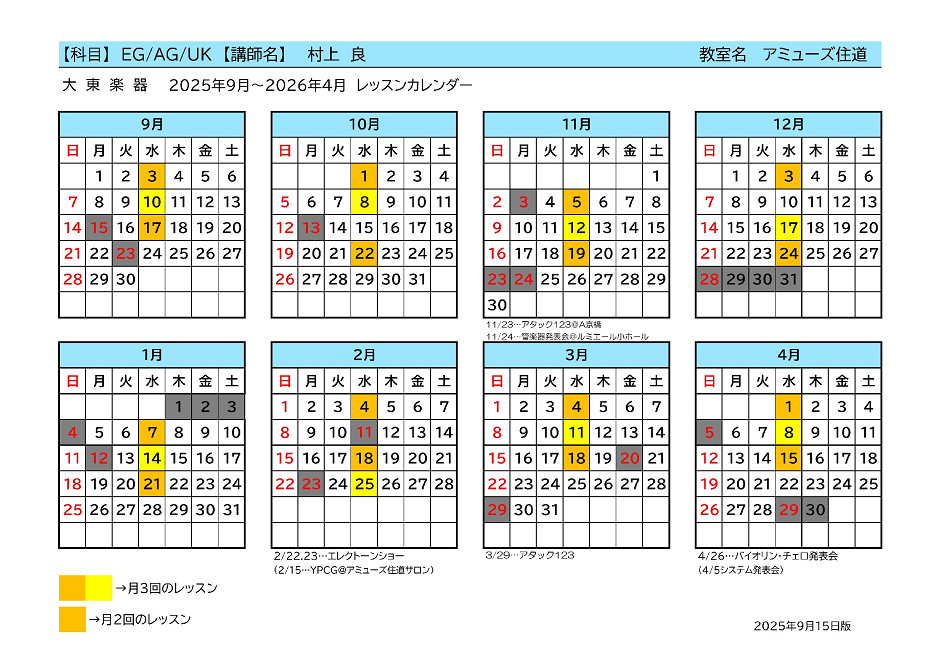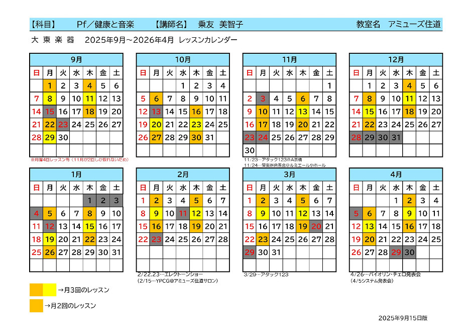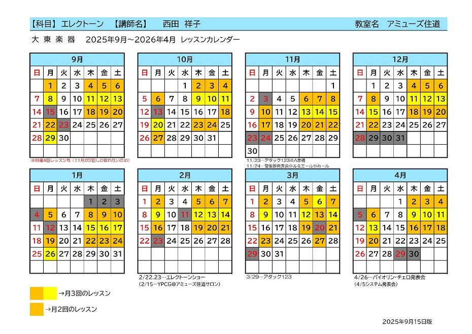 アミューズ住道レッスン日程 2024年10月5日 アミューズ住道 掲載日程と異なる生徒様については、講師よりご案内しておりますのでご注意ください。ご不明点がございましたら教室までお問い合わせください。 ギター・ベース・ウクレレ ドラム ボーカル・ゴスペル サックス・フルート・オカリナ トランペット・トロンボーン バイオリン・チェロ ピアノ・エレクトーン その他 ギター・ベース・ウクレレ 森川国彦 (月:ギター) 難波大介 (火・木・日:ギター・ウクレレ) 村上良 (水:ギター・ウクレレ) 岡森太郎 (木:ギター・ウクレレ) 長谷川和輝 (金:ギター・ウクレレ) 柴田信幸 (土:ギター・ウクレレ) 田路雄一 (土:ギター・ウクレレ) 前田洋二 (火:エレキベース・ウクレレ) 山田進人 (日:エレキベース・ウクレレ) 福山敦子 (木:クラシックギター) このページの上へ ドラム 鈴木正人 (月・木・土:ドラム) 井戸本勝裕 (火・水:ドラム) 守田未玖 (金:ドラム) 小川洋三 (土:ドラム) 植松波音 (日:ドラム) このページの上へ ボーカル・ゴスペル 立花さゆり (月:ボーカル) 阪下夏美 (金:ボーカル) 西田祥子 (月・火・木・土:ボーカル) 西田祥子 (土・日:ゴスペル) このページの上へ サックス・フルート・オカリナ 徳永秀峰 (火:サックス) 笹岡志帆 (水:サックス) 黒川正治 (木:サックス) 小川欽司郎 (金:サックス) 西尾豊隆 (土:サックス) 佐藤友香(日:サックス) 下橋紋子 (水:フルート・オカリナ) このページの上へ トランペット・トロンボーン 石井茜 (火:トランペット) 山﨑友加 (土:トランペット) 中川雄貴 (金:トロンボーン) このページの上へ バイオリン・チェロ 栗山明弓 (水:バイオリン) 辻本馨 (木:バイオリン) 大津さゆり (金:バイオリン) このページの上へ ピアノ・エレクトーン 乗友美智子 (月・木:ピアノ・エレクトーン・健康と音楽) 岸本裕子 (月・金・土:ピアノ) 山添雅子 (火:ピアノ) 西田純子 (水:ピアノ) 足立由美子 (金:ピアノ) 駒田佐知子(土:ピアノ) 西田祥子 (月・木・金・土:エレクトーン) 安田直子 (月・火・水・土・日:エレクトーン) 中島千栄子 (火・金・土・日:エレクトーン) 吉岡幸子 (水・木・土:エレクトーン) このページの上へ その他 西田祥子 (月・水・金:青春ポップス) 乗友美智子 (月・木:ピアノ・エレクトーン・健康と音楽) 吉岡寛子 (月・木:大正琴) 山内淳史講師 (ビックバンド) このページの上へ お問い合わせ アミューズ住道 TEL:072-874-0086 E-mail:amuse-sumi@daito-gakki.co.jp
