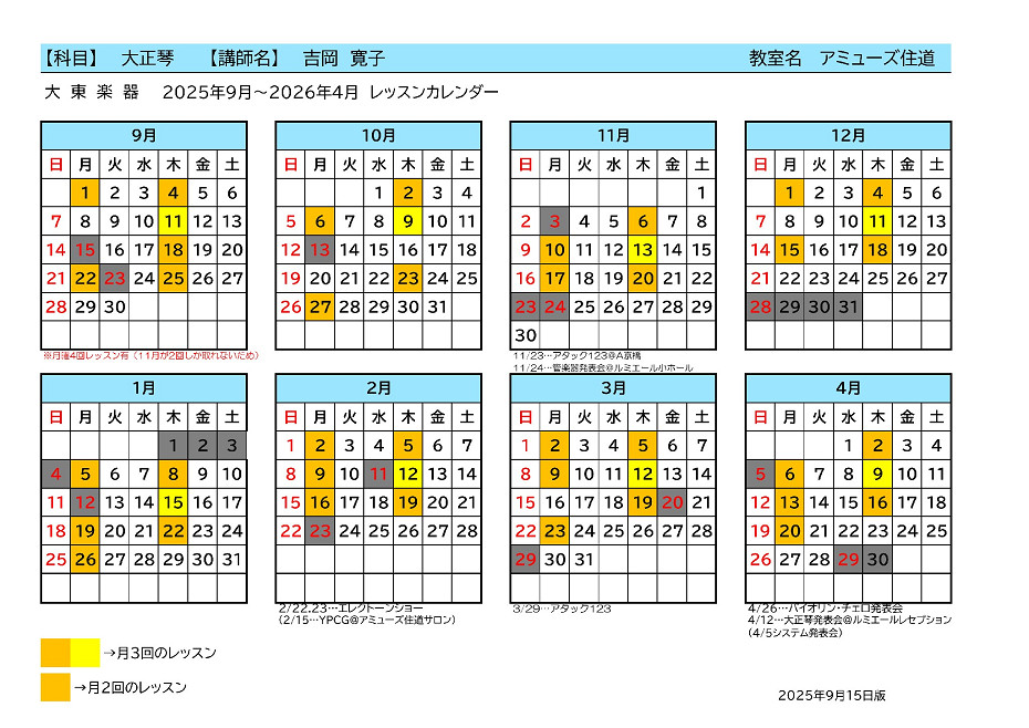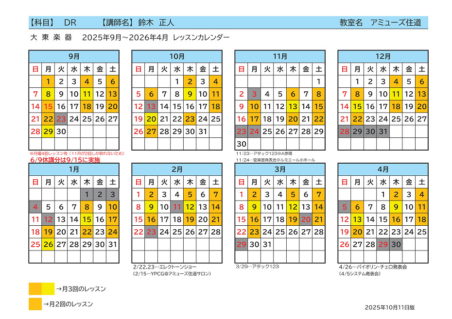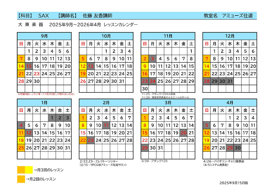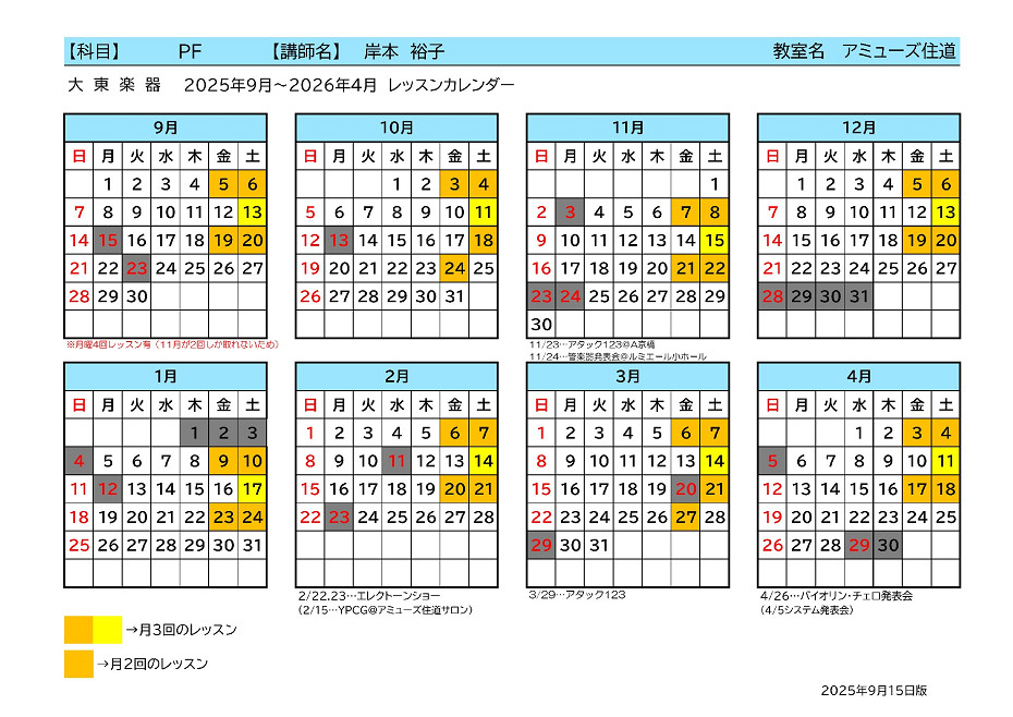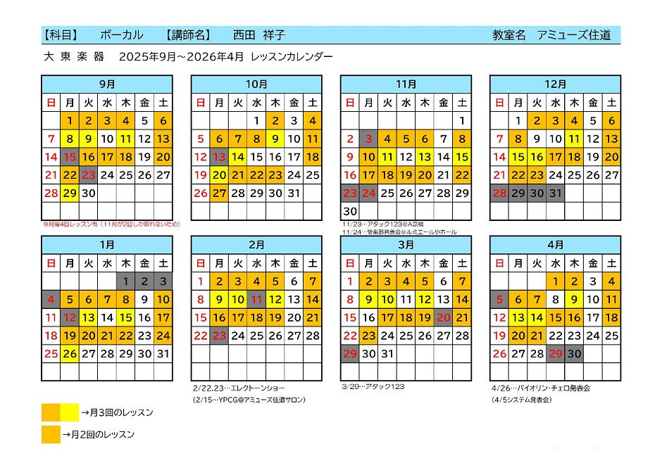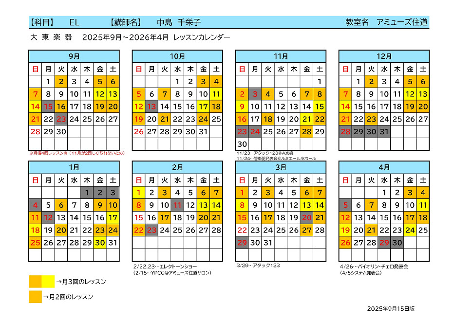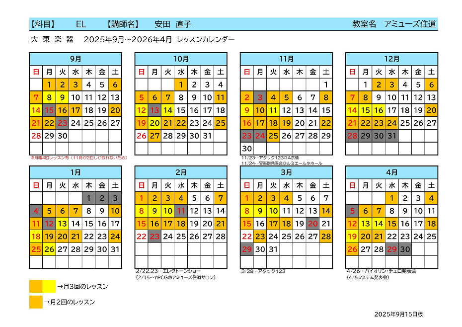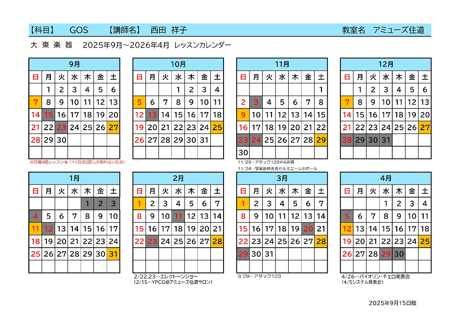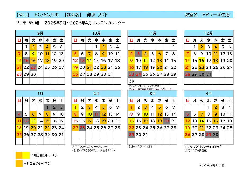 アミューズ住道レッスン日程 2024年10月5日 アミューズ住道 掲載日程と異なる生徒様については、講師よりご案内しておりますのでご注意ください。ご不明点がございましたら教室までお問い合わせください。 ギター・ベース・ウクレレ ドラム ボーカル・ゴスペル サックス・フルート・オカリナ トランペット・トロンボーン バイオリン・チェロ ピアノ・エレクトーン その他 ギター・ベース・ウクレレ 森川国彦 (月:ギター) 難波大介 (火・木・日:ギター・ウクレレ) 村上良 (水:ギター・ウクレレ) 岡森太郎 (木:ギター・ウクレレ) 長谷川和輝 (金:ギター・ウクレレ) 柴田信幸 (土:ギター・ウクレレ) 田路雄一 (土:ギター・ウクレレ) 前田洋二 (火:エレキベース・ウクレレ) 山田進人 (日:エレキベース・ウクレレ) 福山敦子 (木:クラシックギター) このページの上へ ドラム 鈴木正人 (月・木・土:ドラム) 井戸本勝裕 (火・水:ドラム) 守田未玖 (金:ドラム) 小川洋三 (土:ドラム) 植松波音 (日:ドラム) このページの上へ ボーカル・ゴスペル 立花さゆり (月:ボーカル) 阪下夏美 (金:ボーカル) 西田祥子 (月・火・木・土:ボーカル) 西田祥子 (土・日:ゴスペル) このページの上へ サックス・フルート・オカリナ 徳永秀峰 (火:サックス) 笹岡志帆 (水:サックス) 黒川正治 (木:サックス) 小川欽司郎 (金:サックス) 西尾豊隆 (土:サックス) 佐藤友香(日:サックス) 下橋紋子 (水:フルート・オカリナ) このページの上へ トランペット・トロンボーン 石井茜 (火:トランペット) 山﨑友加 (土:トランペット) 中川雄貴 (金:トロンボーン) このページの上へ バイオリン・チェロ 栗山明弓 (水:バイオリン) 辻本馨 (木:バイオリン) 大津さゆり (金:バイオリン) このページの上へ ピアノ・エレクトーン 乗友美智子 (月・木:ピアノ・エレクトーン・健康と音楽) 岸本裕子 (月・金・土:ピアノ) 山添雅子 (火:ピアノ) 西田純子 (水:ピアノ) 足立由美子 (金:ピアノ) 駒田佐知子(土:ピアノ) 西田祥子 (月・木・金・土:エレクトーン) 安田直子 (月・火・水・土・日:エレクトーン) 中島千栄子 (火・金・土・日:エレクトーン) 吉岡幸子 (水・木・土:エレクトーン) このページの上へ その他 西田祥子 (月・水・金:青春ポップス) 乗友美智子 (月・木:ピアノ・エレクトーン・健康と音楽) 吉岡寛子 (月・木:大正琴) 山内淳史講師 (ビックバンド) このページの上へ お問い合わせ アミューズ住道 TEL:072-874-0086 E-mail:amuse-sumi@daito-gakki.co.jp