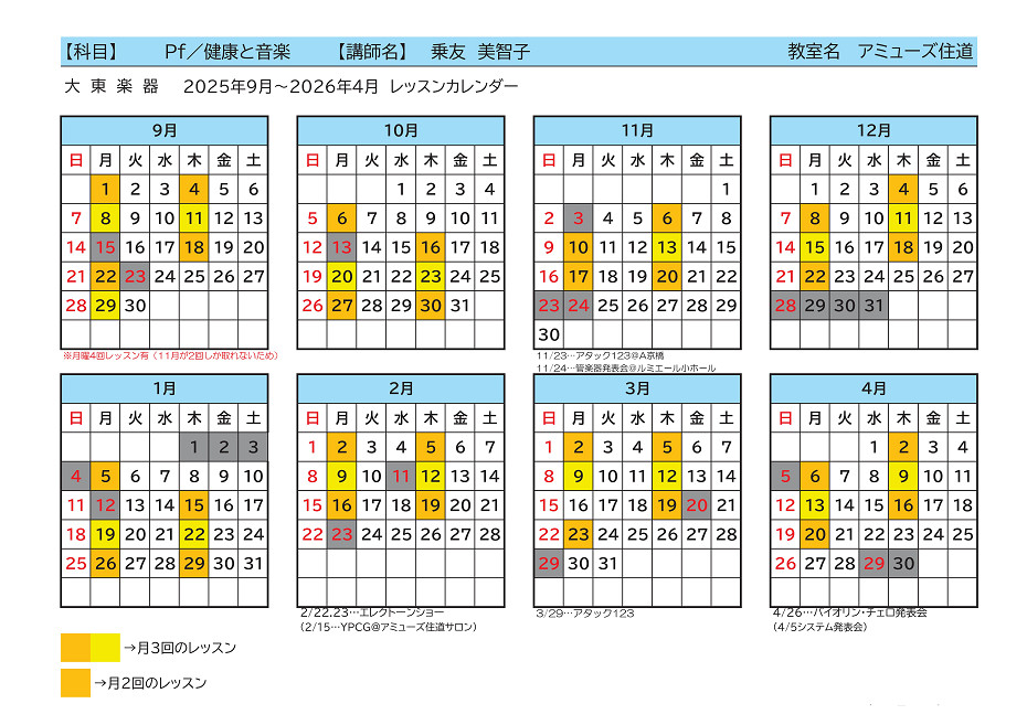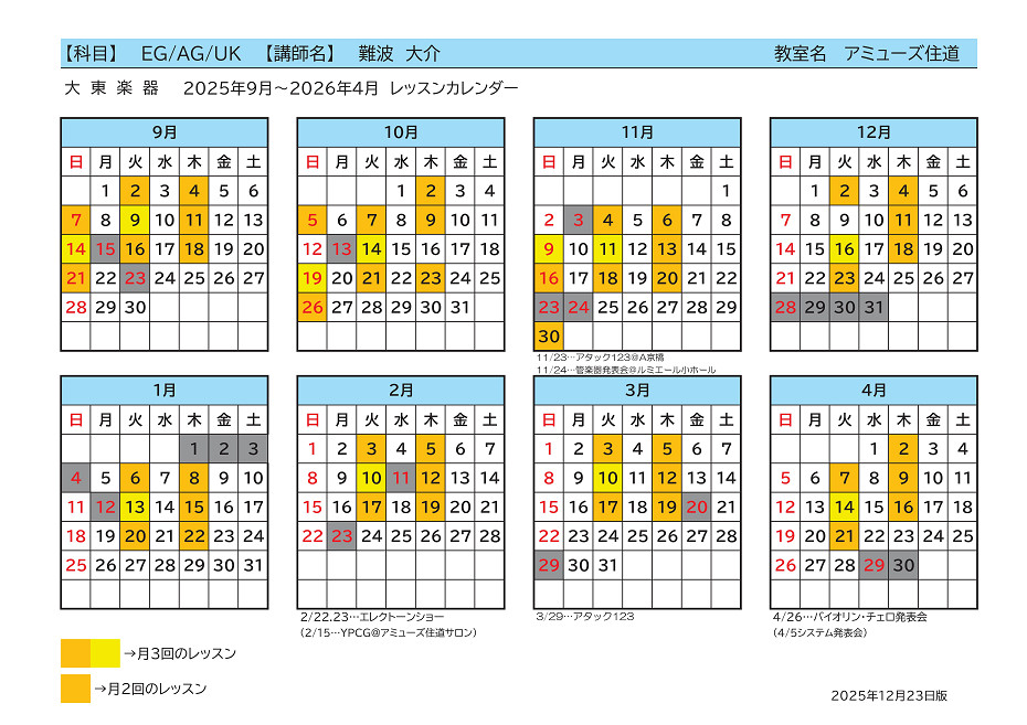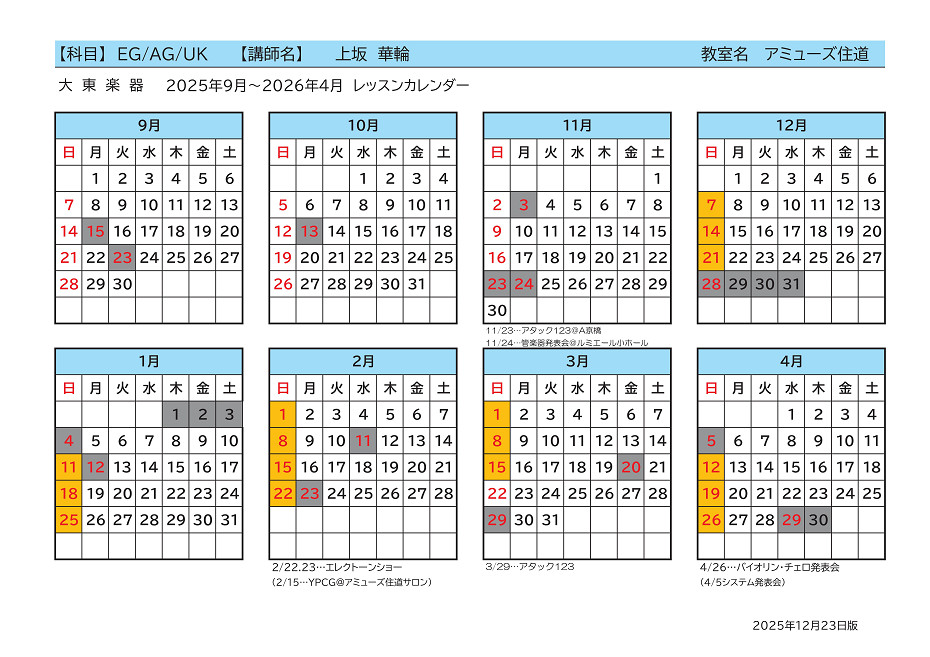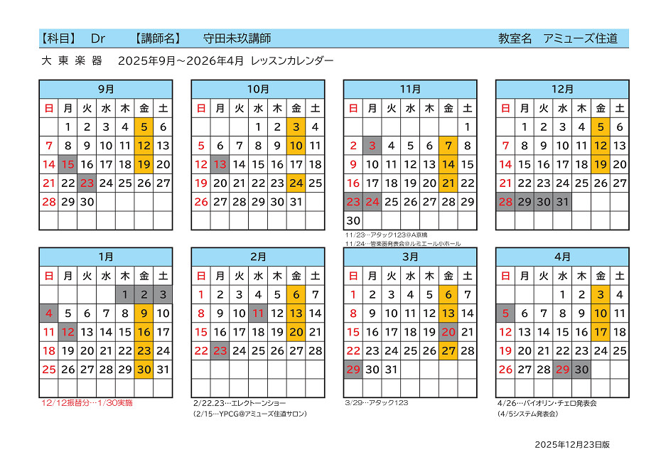 アミューズ住道レッスン日程 2024年10月5日 アミューズ住道 掲載日程と異なる生徒様については、講師よりご案内しておりますのでご注意ください。ご不明点がございましたら教室までお問い合わせください。 ギター・ベース・ウクレレ ドラム ボーカル・ゴスペル サックス・フルート・オカリナ トランペット・トロンボーン バイオリン・チェロ ピアノ・エレクトーン その他 ギター・ベース・ウクレレ 森川国彦 (月:ギター) 難波大介 (火・木・日:ギター・ウクレレ) 村上良 (水:ギター・ウクレレ) 岡森太郎 (木:ギター・ウクレレ) 長谷川和輝 (金:ギター・ウクレレ) 柴田信幸 (土:ギター・ウクレレ) 田路雄一 (土:ギター・ウクレレ) 上坂華輪(日:ギター・ウクレレ) 前田洋二 (火:エレキベース・ウクレレ) 山田進人 (日:エレキベース・ウクレレ) 福山敦子 (木:クラシックギター) このページの上へ ドラム 鈴木正人 (月・木・土:ドラム) 井戸本勝裕 (火・水:ドラム) 守田未玖 (金:ドラム) 小川洋三 (土:ドラム) 植松波音 (日:ドラム) このページの上へ ボーカル・ゴスペル 立花さゆり (月:ボーカル) 阪下夏美 (金:ボーカル) 西田祥子 (月・火・木・土:ボーカル) 西田祥子 (土・日:ゴスペル) このページの上へ サックス・フルート・オカリナ 徳永秀峰 (火:サックス) 笹岡志帆 (水:サックス) 黒川正治 (木:サックス) 小川欽司郎 (金:サックス) 西尾豊隆 (土:サックス) 佐藤友香(日:サックス) 下橋紋子 (水:フルート・オカリナ) このページの上へ トランペット・トロンボーン 石井茜 (火:トランペット) 山﨑友加 (土:トランペット) 中川雄貴 (金:トロンボーン) このページの上へ バイオリン・チェロ 栗山明弓 (水:バイオリン) 辻本馨 (木:バイオリン) 大津さゆり (金:バイオリン) このページの上へ ピアノ・エレクトーン 乗友美智子 (月・木:ピアノ・エレクトーン・健康と音楽) 岸本裕子 (月・金・土:ピアノ) 山添雅子 (火:ピアノ) 西田純子 (水:ピアノ) 足立由美子 (金:ピアノ) 駒田佐知子(土:ピアノ) 西田祥子 (月・木・金・土:エレクトーン) 安田直子 (月・火・水・土・日:エレクトーン) 中島千栄子 (火・金・土・日:エレクトーン) 吉岡幸子 (水・木・土:エレクトーン) このページの上へ その他 西田祥子 (月・水・金:青春ポップス) 乗友美智子 (月・木:ピアノ・エレクトーン・健康と音楽) 吉岡寛子 (月・木:大正琴) 山内淳史講師 (ビックバンド) このページの上へ お問い合わせ アミューズ住道 TEL:072-874-0086 E-mail:amuse-sumi@daito-gakki.co.jp