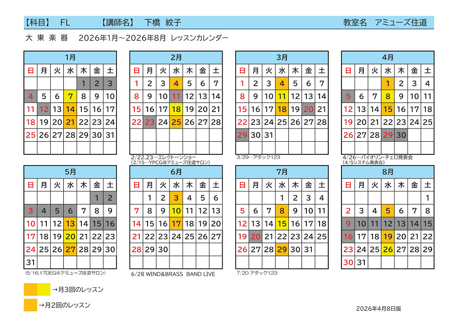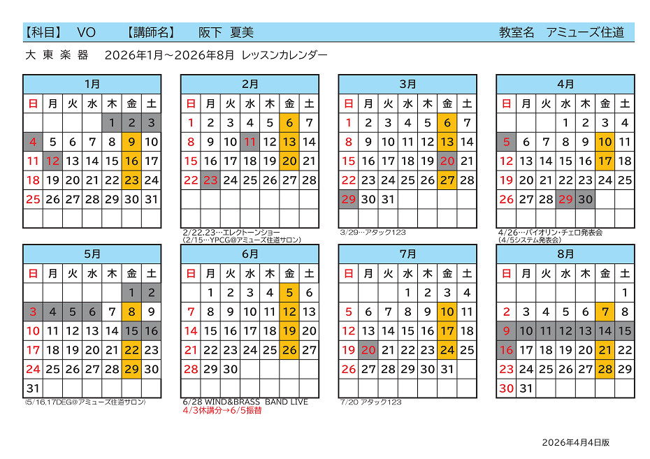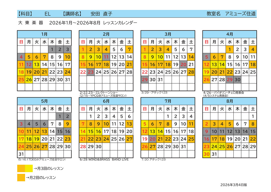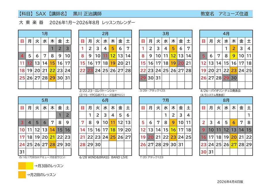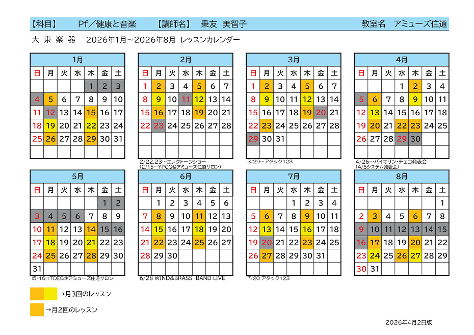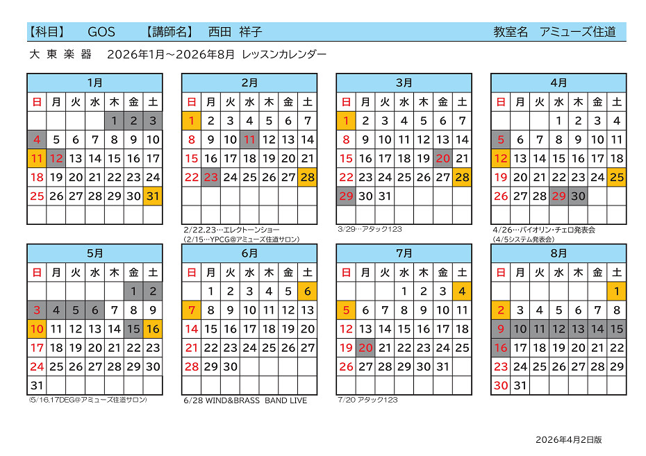 アミューズ住道レッスン日程 2026年1月24日 アミューズ住道 掲載日程と異なる生徒様については、講師よりご案内しておりますのでご注意ください。ご不明点がございましたら教室までお問い合わせください。 ギター・ベース・ウクレレ ドラム ボーカル・ゴスペル サックス・フルート・オカリナ トランペット・トロンボーン バイオリン・チェロ ピアノ・エレクトーン その他 ギター・ベース・ウクレレ 森川国彦 (月:ギター) 難波大介 (火・木・日:ギター・ウクレレ) 村上良 (水:ギター・ウクレレ) 岡森太郎 (木:ギター・ウクレレ) 長谷川和輝 (金:ギター・ウクレレ) 柴田信幸 (土:ギター・ウクレレ) 田路雄一 (土:ギター・ウクレレ) 上坂華輪(日:ギター・ウクレレ) 前田洋二 (火:エレキベース・ウクレレ) 山田進人 (日:エレキベース・ウクレレ) 福山敦子 (木:クラシックギター) このページの上へ ドラム 鈴木正人 (月・木・土:ドラム) 井戸本勝裕 (火・水:ドラム) 守田未玖 (金:ドラム) 小川洋三 (土:ドラム) 植松波音 (日:ドラム) このページの上へ ボーカル・ゴスペル 立花さゆり (月:ボーカル) 阪下夏美 (金:ボーカル) 西田祥子 (月・火・木・土:ボーカル) 西田祥子 (土・日:ゴスペル) このページの上へ サックス・フルート・オカリナ 徳永秀峰 (火:サックス) 笹岡志帆 (水:サックス) 黒川正治 (木:サックス) 小川欽司郎 (金:サックス) 西尾豊隆 (土:サックス) 佐藤友香(日:サックス) 下橋紋子 (水:フルート・オカリナ) このページの上へ トランペット・トロンボーン 石井茜 (火:トランペット) 山﨑友加 (土:トランペット) 中川雄貴 (金:トロンボーン) このページの上へ バイオリン・チェロ 栗山明弓 (水:バイオリン) 辻本馨 (木:バイオリン) 大津さゆり (金:バイオリン) このページの上へ ピアノ・エレクトーン 乗友美智子 (月・木:ピアノ・エレクトーン・健康と音楽) 岸本裕子 (月・金・土:ピアノ) 山添雅子 (火:ピアノ) 西田純子 (水:ピアノ) 足立由美子 (金:ピアノ) 駒田佐知子(土:ピアノ) 西田祥子 (月・木・金・土:エレクトーン) 安田直子 (月・火・水・土・日:エレクトーン) 中島千栄子 (火・金・土・日:エレクトーン) 吉岡幸子 (水・木・土:エレクトーン) このページの上へ その他 西田祥子 (月・水・金:青春ポップス) 乗友美智子 (月・木:ピアノ・エレクトーン・健康と音楽) 吉岡寛子 (月・木:大正琴) 山内淳史講師 (ビックバンド) このページの上へ お問い合わせ アミューズ住道 TEL:072-874-0086 E-mail:amuse-sumi@daito-gakki.co.jp