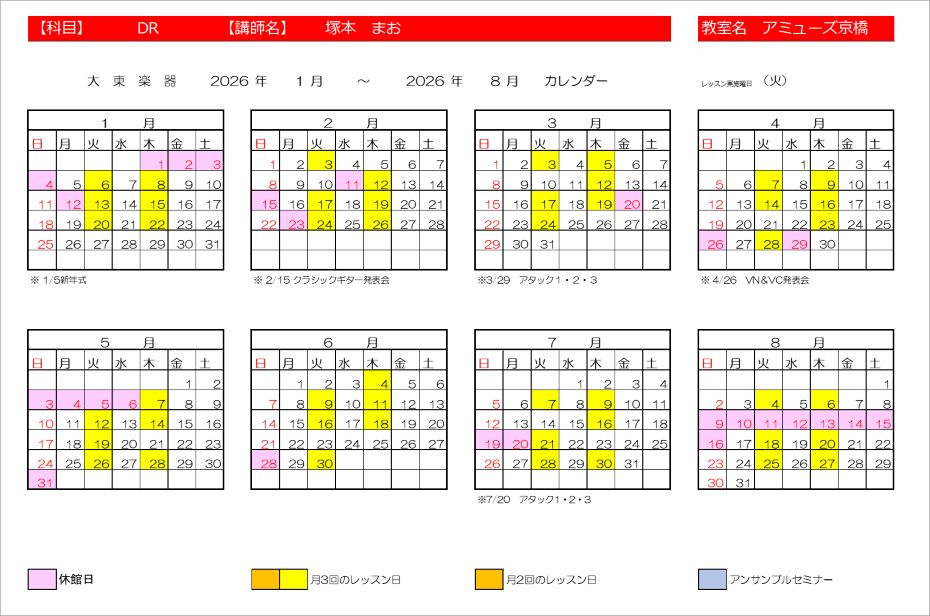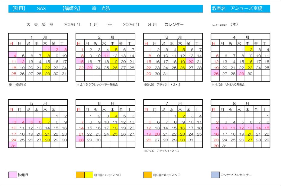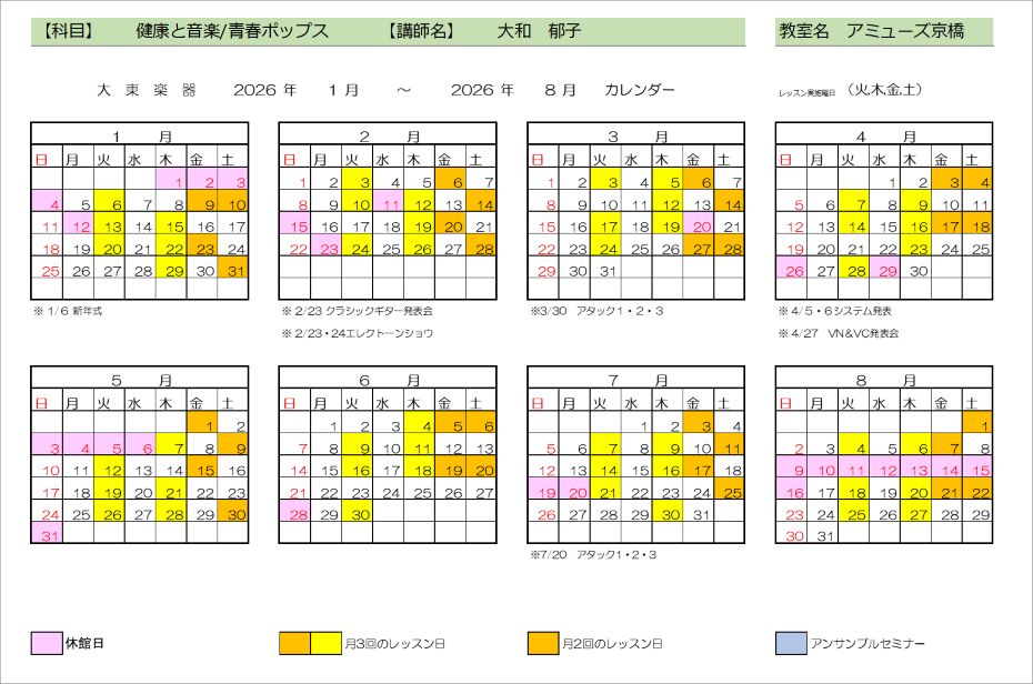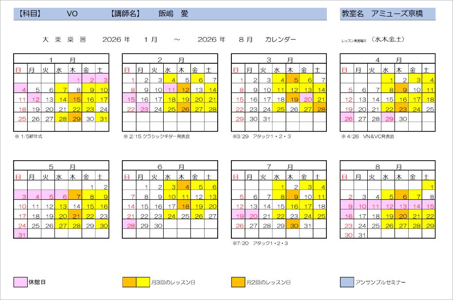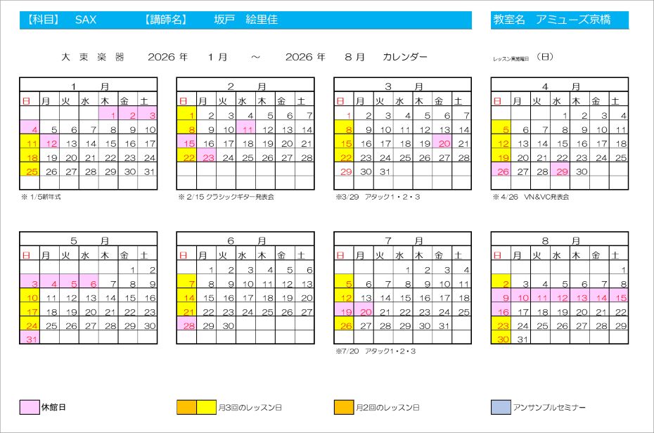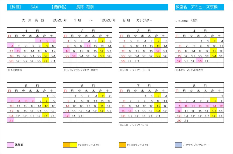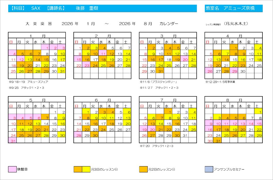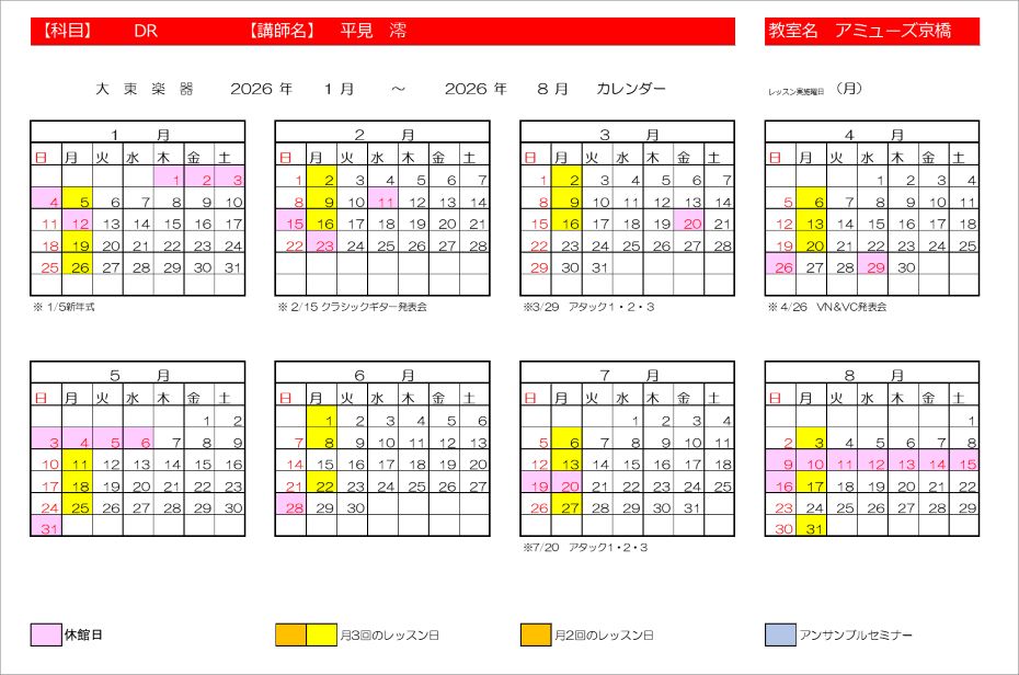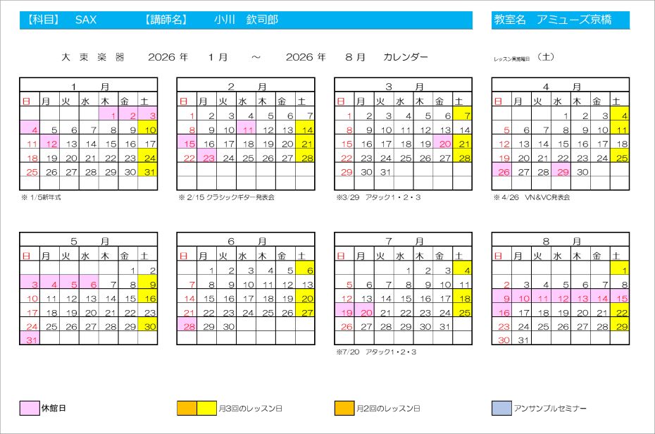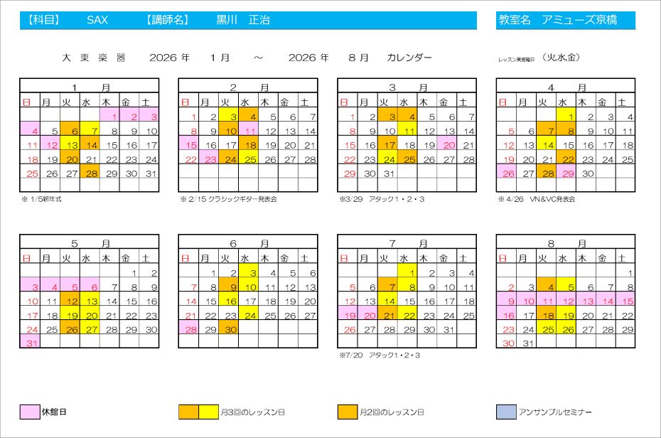 アミューズ京橋レッスン日程 2026年2月1日 アミューズ京橋 2026年1月~2026年8月までのレッスンスケジュールです。 更新日2026.2.1 ピアノ・キーボード・ピアニカ ボーカル・ゴスペル・ジャズボーカル ギター・ベース・ウクレレ ドラム バイオリン・チェロ サックス・アンサンブルセミナー トランペット・トロンボーン クラリネット・アンサンブルセミナー フルート・オカリナ・リコーダー ケーナ・フルートアンサブルセミナー 和楽器 その他 ピアノ・キーボード・ピアニカ 森本先生 (ピアノ:月・金) 仙波先生 (ピアノ・キーボード:月・水) 本庄先生 (ピアノ:火・木) 黒川先生 (ピアノ:火・日) 深田先生 (ピアノ・ピアニカ:月・水) 足立先生 (ピアノ:木) 貝塚先生 (ピアノ・ピアニカ:金・土) 平尾先生 (ピアノ:土) 岡本先生 (ピアノ:日) このページの上へ ボーカル・ゴスペル・ジャズボーカル 松田先生 (ボーカル:月) 飯嶋先生 (ボーカル:水・木・金・土) 蔵下先生 (ボーカル・ゴスペル:木・土) 岡本先生 (ボーカル:日) 佐川先生 (ジャズボーカル:月・土) このページの上へ ギター・ベース・ウクレレ 清舩先生 (ギター・ウクレレ:月) 島田先生 (ギター・ウクレレ:火) 苅田先生 (ギター・ウクレレ:火) 岡森先生 (ギター・ウクレレ:水・土) 北垣先生 (ギター・ウクレレ:木) 前田先生 (ギター・ウクレレ:日) 前田先生 (ギター・ウクレレ:木/1,3週) 前田先生 (ギター・ウクレレ:木/2,4週) 澤田先生 (ギター・ウクレレ:金) 清水先生 (ギター・ウクレレ:金) 川口先生 (ギター・ウクレレ:土) 飯田先生 (ギター・ウクレレ:日) 山田先生 (ベース・ウクレレ:金) 中村先生 (ベース・ウクレレ:日) このページの上へ ドラム 平見先生 (ドラム:月) 恩田先生 (ドラム:火) 塚本先生 (ドラム:火・木) 山口先生 (ドラム・ジュニアドラム:水・日) 坂東先生 (ドラム:水) 河上先生 (ドラム:木・土) 中山先生 (ドラム:金) このページの上へ バイオリン・チェロ 池田先生 (バイオリン:月) 冨山先生 (バイオリン:月・火) 佐藤先生 (バイオリン:火・水・木・金・土) 磯辺先生 (バイオリン:水) 八原先生 (バイオリン:日) 南口先生 (チェロ:月) 島田先生 (チェロ:木) 鍋谷先生 (チェロ:金・土) このページの上へ サックス・アンサンブルセミナー 後藤先生 (サックス:月・火・水・木・土) 後藤先生 (アンサンブルセミナー:水・金・日) 杉本先生 (サックス:月) 黒川先生 (サックス:火・水・金) 森先生 (サックス:木) 長澤先生 (サックス:金) 小川先生 (サックス:土) 坂戸先生 (サックス:日) 後藤先生 (EWI・ビックバンド:日) このページの上へ トランペット・トロンボーン・クラリネット・アンサンブルセミナー 木下先生 (トランペット:月・火) 谷先生 (トランペット:土) 矢部先生 (トロンボーン:水) 山内先生 (トロンボーン:木) 西畑先生 (クラリネット:火) 尾崎先生 (クラリネット・アンサンブルセミナー:木) 藤倉先生 (クラリネット:土) このページの上へ フルート・オカリナ・リコーダー・ケーナ・フルートアンサブルセミナー 大西先生 (フルート・オカリナ・アンサンブルセミナー:月・日) 大賀先生 (フルート:火) 林先生 (フルート:火) 板垣先生 (フルート・オカリナ・リコーダー・ケーナ:水・土) 中木先生 (フルート・オカリナ:水) 大石先生 (フルート:木) このページの上へ 和楽器 杵屋先生 (長唄三味線:火) 翔田先生 (津軽三味線:金・土) 伊藤先生 (お箏:金) このページの上へ その他 朴先生 (クラシックオルガン:月・水) 福山先生 (クラシックギター:月・金) 多武先生 (マンドリン:月) 塚脇先生 (二胡:水・土) 大田先生 (ヴィオリラ:金) 大和先生 (健康と音楽・青春ポップス:火・木・金) 芝田先生 (青春ポップス:月) 宮﨑先生 (うた声:火) このページの上へ お問い合わせ アミューズ京橋 TEL:06-6352-5576 E-mail:amuse@daito-gakki.co.jp