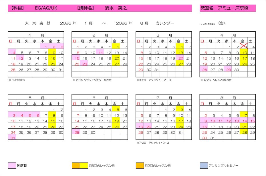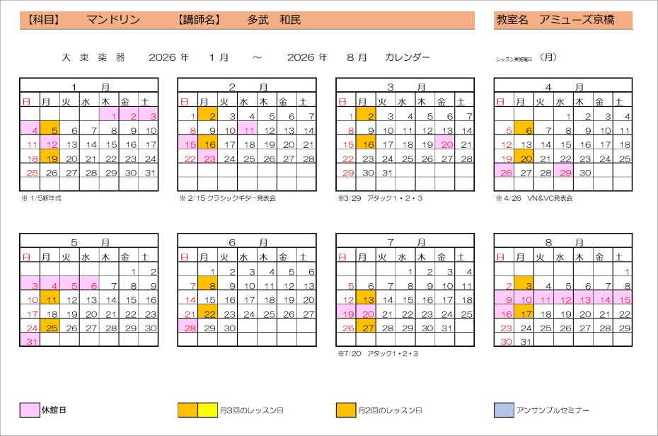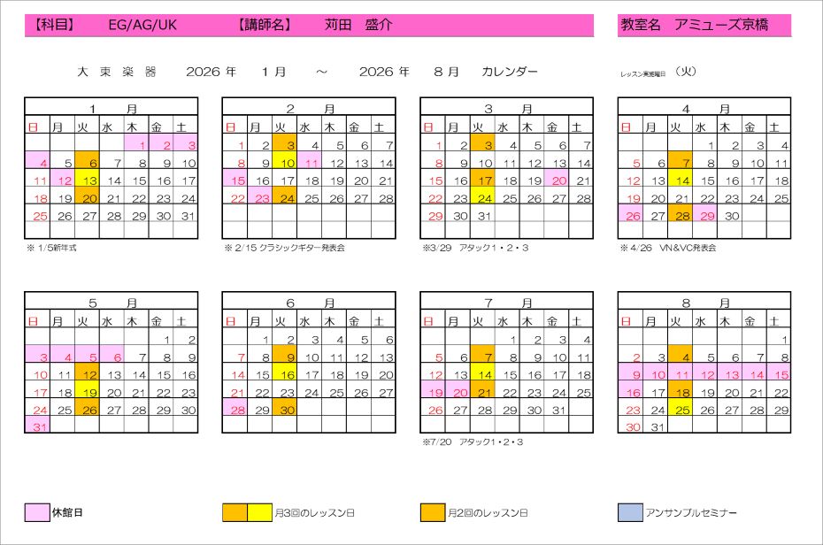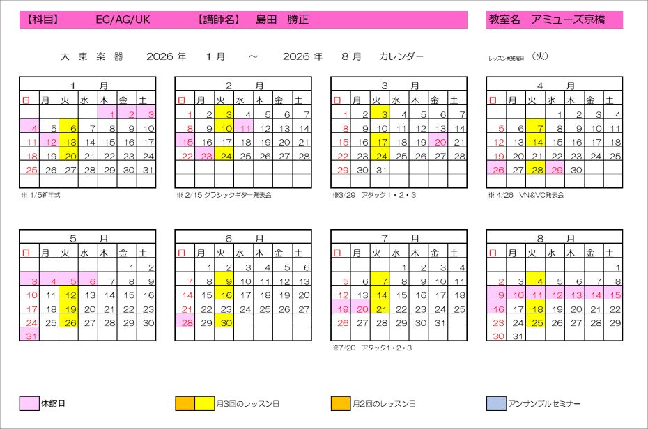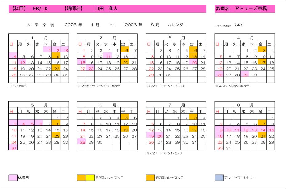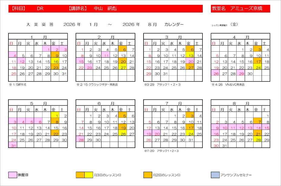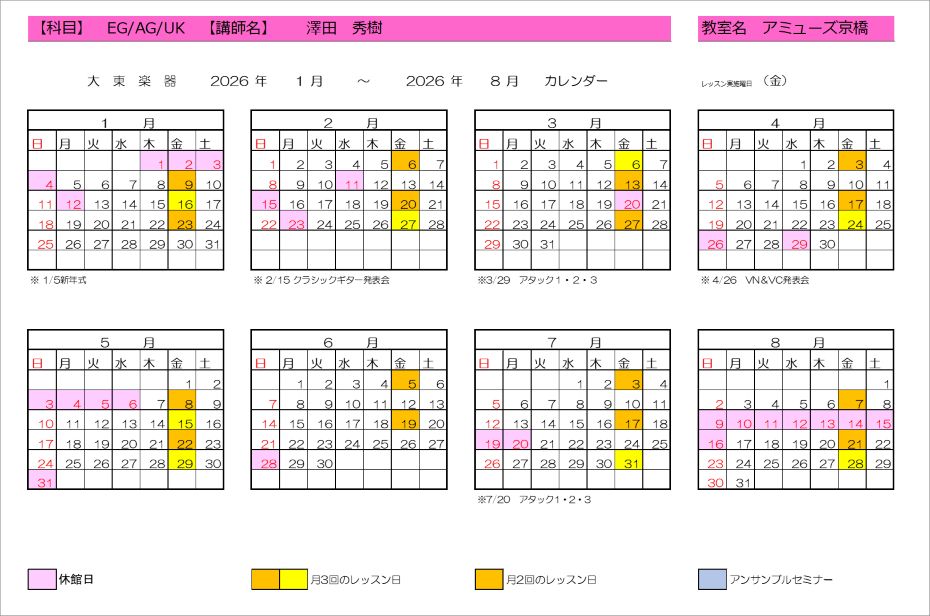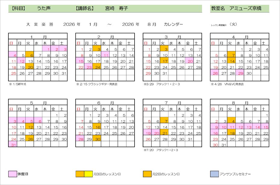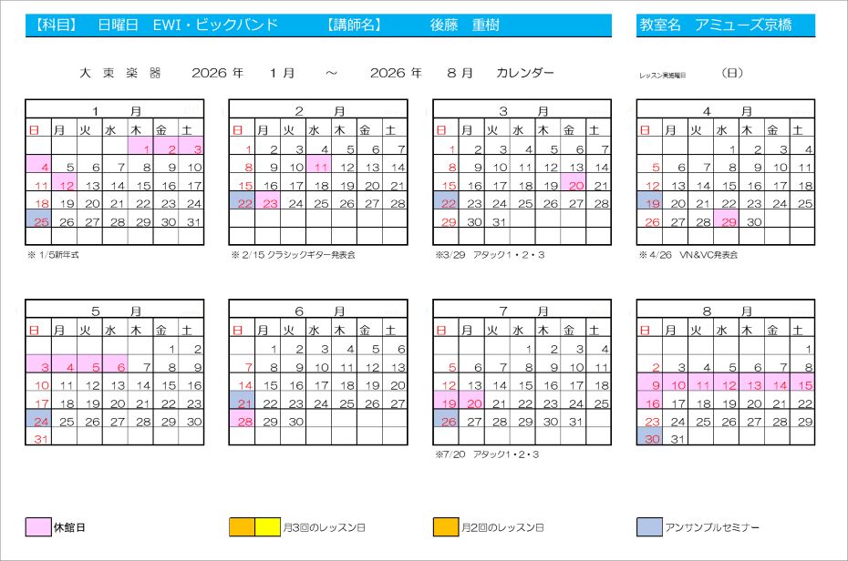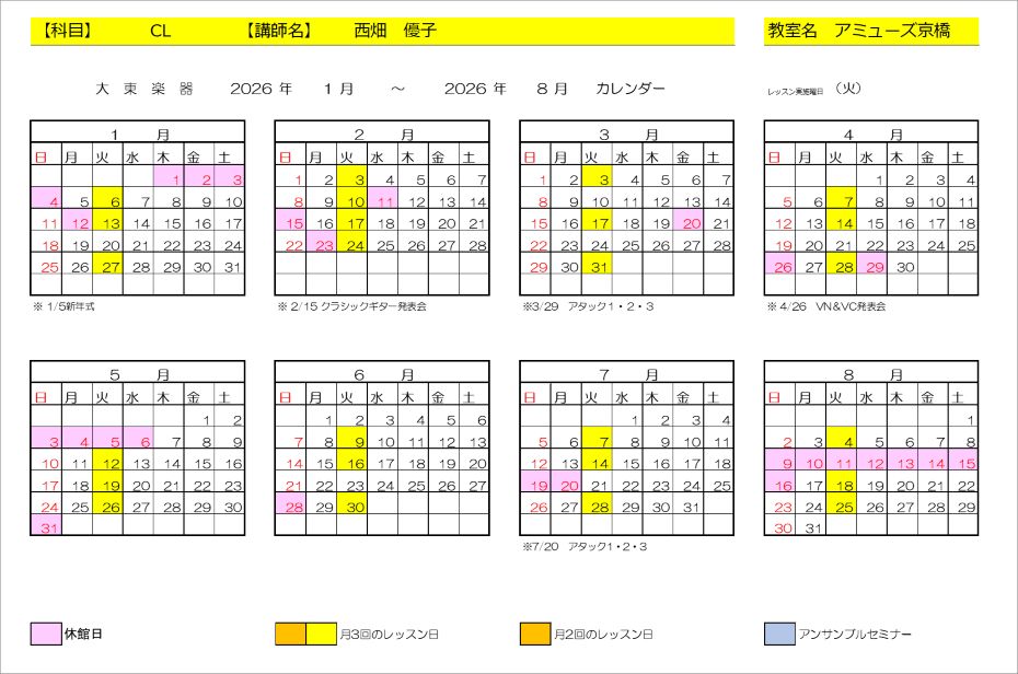 アミューズ京橋レッスン日程 2026年2月1日 アミューズ京橋 2026年1月~2026年8月までのレッスンスケジュールです。 更新日2026.2.1 ピアノ・キーボード・ピアニカ ボーカル・ゴスペル・ジャズボーカル ギター・ベース・ウクレレ ドラム バイオリン・チェロ サックス・アンサンブルセミナー トランペット・トロンボーン クラリネット・アンサンブルセミナー フルート・オカリナ・リコーダー ケーナ・フルートアンサブルセミナー 和楽器 その他 ピアノ・キーボード・ピアニカ 森本先生 (ピアノ:月・金) 仙波先生 (ピアノ・キーボード:月・水) 本庄先生 (ピアノ:火・木) 黒川先生 (ピアノ:火・日) 深田先生 (ピアノ・ピアニカ:月・水) 足立先生 (ピアノ:木) 貝塚先生 (ピアノ・ピアニカ:金・土) 平尾先生 (ピアノ:土) 岡本先生 (ピアノ:日) このページの上へ ボーカル・ゴスペル・ジャズボーカル 松田先生 (ボーカル:月) 飯嶋先生 (ボーカル:水・木・金・土) 蔵下先生 (ボーカル・ゴスペル:木・土) 岡本先生 (ボーカル:日) 佐川先生 (ジャズボーカル:月・土) このページの上へ ギター・ベース・ウクレレ 清舩先生 (ギター・ウクレレ:月) 島田先生 (ギター・ウクレレ:火) 苅田先生 (ギター・ウクレレ:火) 岡森先生 (ギター・ウクレレ:水・土) 北垣先生 (ギター・ウクレレ:木) 前田先生 (ギター・ウクレレ:日) 前田先生 (ギター・ウクレレ:木/1,3週) 前田先生 (ギター・ウクレレ:木/2,4週) 澤田先生 (ギター・ウクレレ:金) 清水先生 (ギター・ウクレレ:金) 川口先生 (ギター・ウクレレ:土) 飯田先生 (ギター・ウクレレ:日) 山田先生 (ベース・ウクレレ:金) 中村先生 (ベース・ウクレレ:日) このページの上へ ドラム 平見先生 (ドラム:月) 恩田先生 (ドラム:火) 塚本先生 (ドラム:火・木) 山口先生 (ドラム・ジュニアドラム:水・日) 坂東先生 (ドラム:水) 河上先生 (ドラム:木・土) 中山先生 (ドラム:金) このページの上へ バイオリン・チェロ 池田先生 (バイオリン:月) 冨山先生 (バイオリン:月・火) 佐藤先生 (バイオリン:火・水・木・金・土) 磯辺先生 (バイオリン:水) 八原先生 (バイオリン:日) 南口先生 (チェロ:月) 島田先生 (チェロ:木) 鍋谷先生 (チェロ:金・土) このページの上へ サックス・アンサンブルセミナー 後藤先生 (サックス:月・火・水・木・土) 後藤先生 (アンサンブルセミナー:水・金・日) 杉本先生 (サックス:月) 黒川先生 (サックス:火・水・金) 森先生 (サックス:木) 長澤先生 (サックス:金) 小川先生 (サックス:土) 坂戸先生 (サックス:日) 後藤先生 (EWI・ビックバンド:日) このページの上へ トランペット・トロンボーン・クラリネット・アンサンブルセミナー 木下先生 (トランペット:月・火) 谷先生 (トランペット:土) 矢部先生 (トロンボーン:水) 山内先生 (トロンボーン:木) 西畑先生 (クラリネット:火) 尾崎先生 (クラリネット・アンサンブルセミナー:木) 藤倉先生 (クラリネット:土) このページの上へ フルート・オカリナ・リコーダー・ケーナ・フルートアンサブルセミナー 大西先生 (フルート・オカリナ・アンサンブルセミナー:月・日) 大賀先生 (フルート:火) 林先生 (フルート:火) 板垣先生 (フルート・オカリナ・リコーダー・ケーナ:水・土) 中木先生 (フルート・オカリナ:水) 大石先生 (フルート:木) このページの上へ 和楽器 杵屋先生 (長唄三味線:火) 翔田先生 (津軽三味線:金・土) 伊藤先生 (お箏:金) このページの上へ その他 朴先生 (クラシックオルガン:月・水) 福山先生 (クラシックギター:月・金) 多武先生 (マンドリン:月) 塚脇先生 (二胡:水・土) 大田先生 (ヴィオリラ:金) 大和先生 (健康と音楽・青春ポップス:火・木・金) 芝田先生 (青春ポップス:月) 宮﨑先生 (うた声:火) このページの上へ お問い合わせ アミューズ京橋 TEL:06-6352-5576 E-mail:amuse@daito-gakki.co.jp