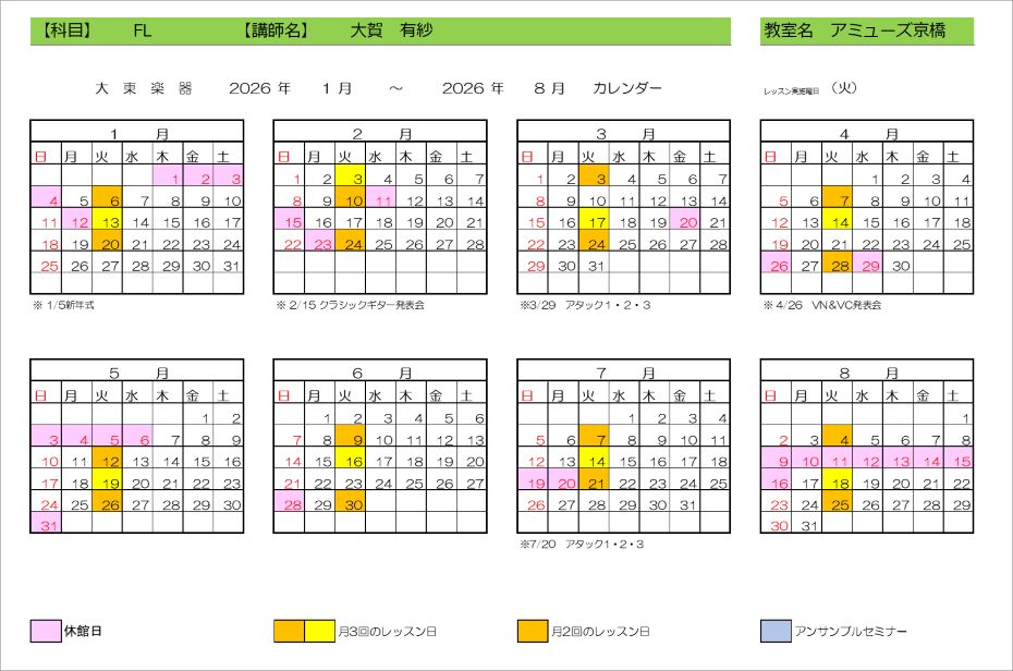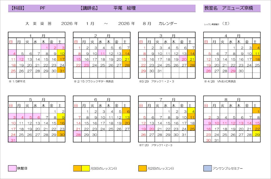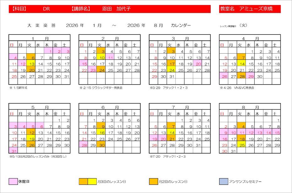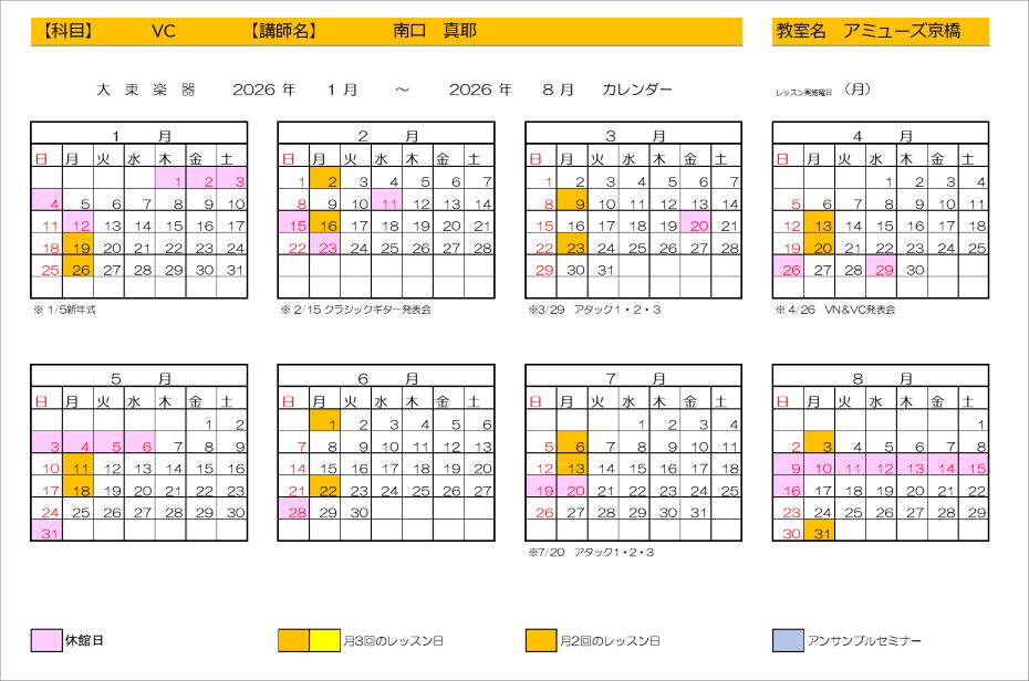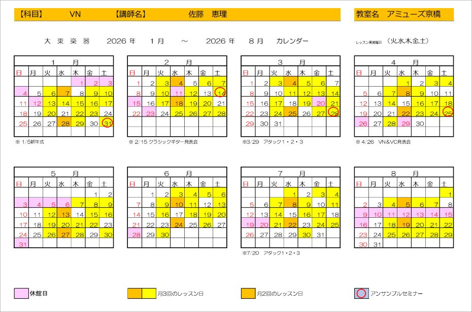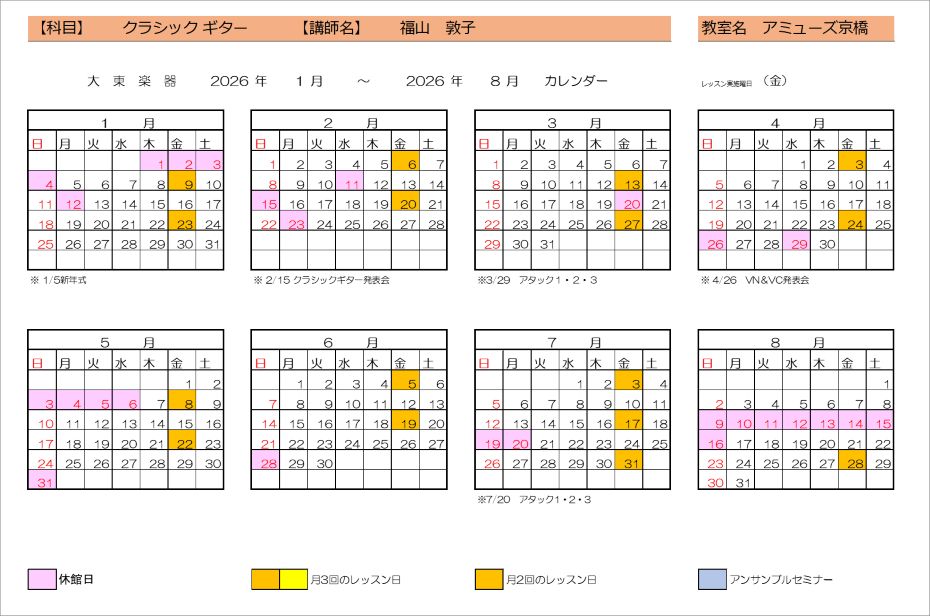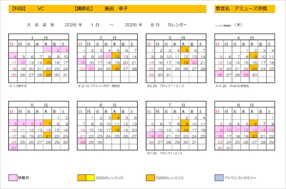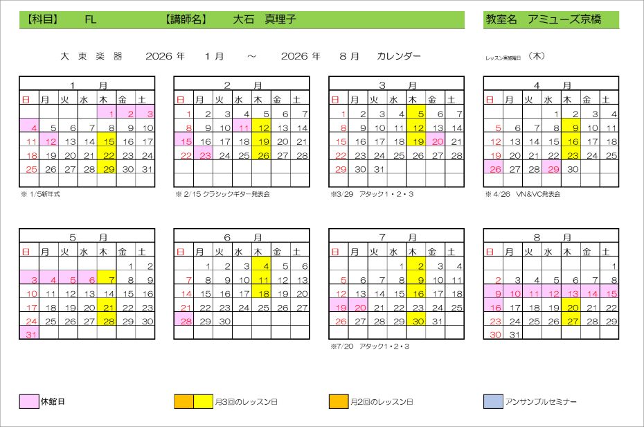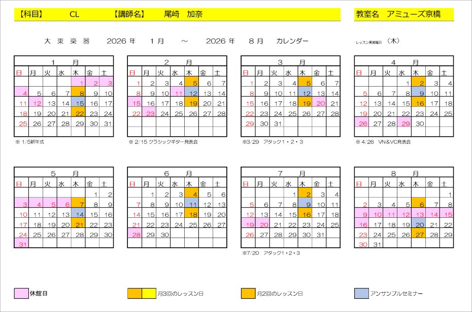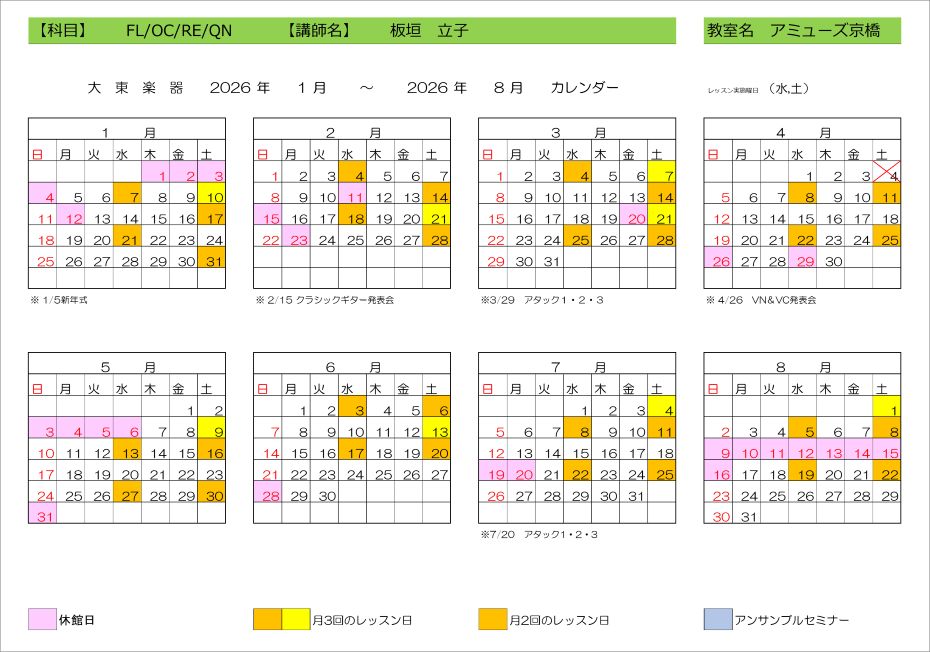 アミューズ京橋レッスン日程 2026年2月1日 アミューズ京橋 2026年1月~2026年8月までのレッスンスケジュールです。 更新日2026.2.1 ピアノ・キーボード・ピアニカ ボーカル・ゴスペル・ジャズボーカル ギター・ベース・ウクレレ ドラム バイオリン・チェロ サックス・アンサンブルセミナー トランペット・トロンボーン クラリネット・アンサンブルセミナー フルート・オカリナ・リコーダー ケーナ・フルートアンサブルセミナー 和楽器 その他 ピアノ・キーボード・ピアニカ 森本先生 (ピアノ:月・金) 仙波先生 (ピアノ・キーボード:月・水) 本庄先生 (ピアノ:火・木) 黒川先生 (ピアノ:火・日) 深田先生 (ピアノ・ピアニカ:月・水) 足立先生 (ピアノ:木) 貝塚先生 (ピアノ・ピアニカ:金・土) 平尾先生 (ピアノ:土) 岡本先生 (ピアノ:日) このページの上へ ボーカル・ゴスペル・ジャズボーカル 松田先生 (ボーカル:月) 飯嶋先生 (ボーカル:水・木・金・土) 蔵下先生 (ボーカル・ゴスペル:木・土) 岡本先生 (ボーカル:日) 佐川先生 (ジャズボーカル:月・土) このページの上へ ギター・ベース・ウクレレ 清舩先生 (ギター・ウクレレ:月) 島田先生 (ギター・ウクレレ:火) 苅田先生 (ギター・ウクレレ:火) 岡森先生 (ギター・ウクレレ:水・土) 北垣先生 (ギター・ウクレレ:木) 前田先生 (ギター・ウクレレ:日) 前田先生 (ギター・ウクレレ:木/1,3週) 前田先生 (ギター・ウクレレ:木/2,4週) 澤田先生 (ギター・ウクレレ:金) 清水先生 (ギター・ウクレレ:金) 川口先生 (ギター・ウクレレ:土) 飯田先生 (ギター・ウクレレ:日) 山田先生 (ベース・ウクレレ:金) 中村先生 (ベース・ウクレレ:日) このページの上へ ドラム 平見先生 (ドラム:月) 恩田先生 (ドラム:火) 塚本先生 (ドラム:火・木) 山口先生 (ドラム・ジュニアドラム:水・日) 坂東先生 (ドラム:水) 河上先生 (ドラム:木・土) 中山先生 (ドラム:金) このページの上へ バイオリン・チェロ 池田先生 (バイオリン:月) 冨山先生 (バイオリン:月・火) 佐藤先生 (バイオリン:火・水・木・金・土) 磯辺先生 (バイオリン:水) 八原先生 (バイオリン:日) 南口先生 (チェロ:月) 島田先生 (チェロ:木) 鍋谷先生 (チェロ:金・土) このページの上へ サックス・アンサンブルセミナー 後藤先生 (サックス:月・火・水・木・土) 後藤先生 (アンサンブルセミナー:水・金・日) 杉本先生 (サックス:月) 黒川先生 (サックス:火・水・金) 森先生 (サックス:木) 長澤先生 (サックス:金) 小川先生 (サックス:土) 坂戸先生 (サックス:日) 後藤先生 (EWI・ビックバンド:日) このページの上へ トランペット・トロンボーン・クラリネット・アンサンブルセミナー 木下先生 (トランペット:月・火) 谷先生 (トランペット:土) 矢部先生 (トロンボーン:水) 山内先生 (トロンボーン:木) 西畑先生 (クラリネット:火) 尾崎先生 (クラリネット・アンサンブルセミナー:木) 藤倉先生 (クラリネット:土) このページの上へ フルート・オカリナ・リコーダー・ケーナ・フルートアンサブルセミナー 大西先生 (フルート・オカリナ・アンサンブルセミナー:月・日) 大賀先生 (フルート:火) 林先生 (フルート:火) 板垣先生 (フルート・オカリナ・リコーダー・ケーナ:水・土) 中木先生 (フルート・オカリナ:水) 大石先生 (フルート:木) このページの上へ 和楽器 杵屋先生 (長唄三味線:火) 翔田先生 (津軽三味線:金・土) 伊藤先生 (お箏:金) このページの上へ その他 朴先生 (クラシックオルガン:月・水) 福山先生 (クラシックギター:月・金) 多武先生 (マンドリン:月) 塚脇先生 (二胡:水・土) 大田先生 (ヴィオリラ:金) 大和先生 (健康と音楽・青春ポップス:火・木・金) 芝田先生 (青春ポップス:月) 宮﨑先生 (うた声:火) このページの上へ お問い合わせ アミューズ京橋 TEL:06-6352-5576 E-mail:amuse@daito-gakki.co.jp