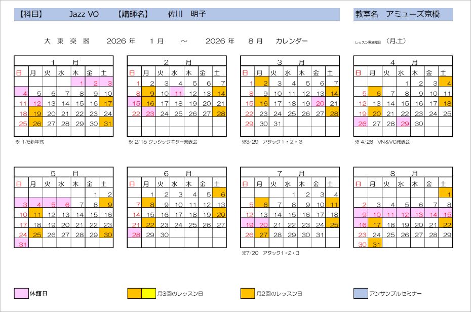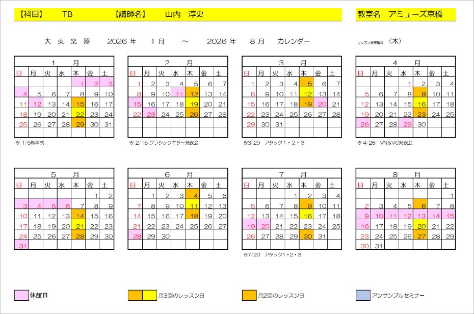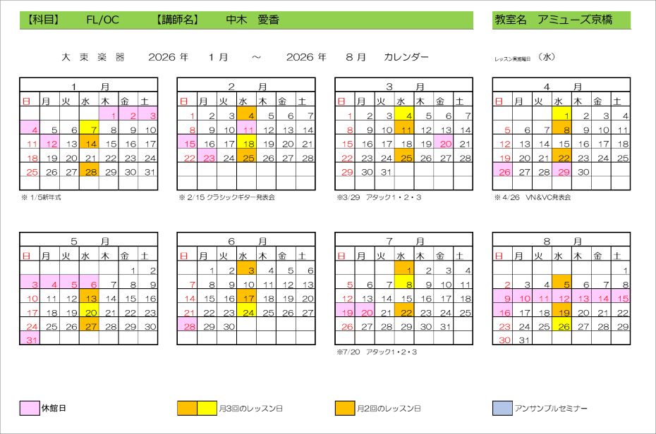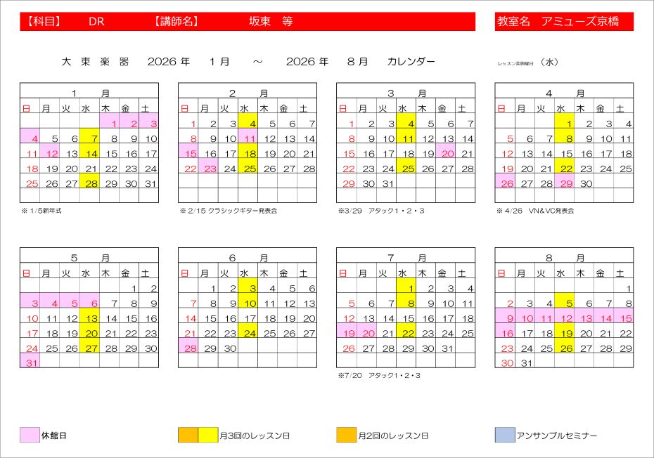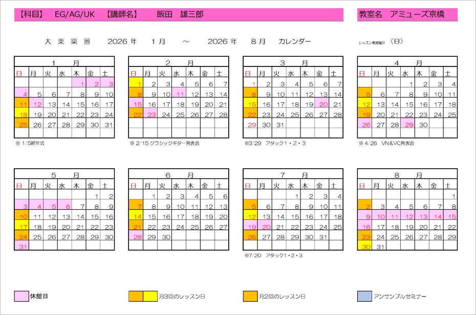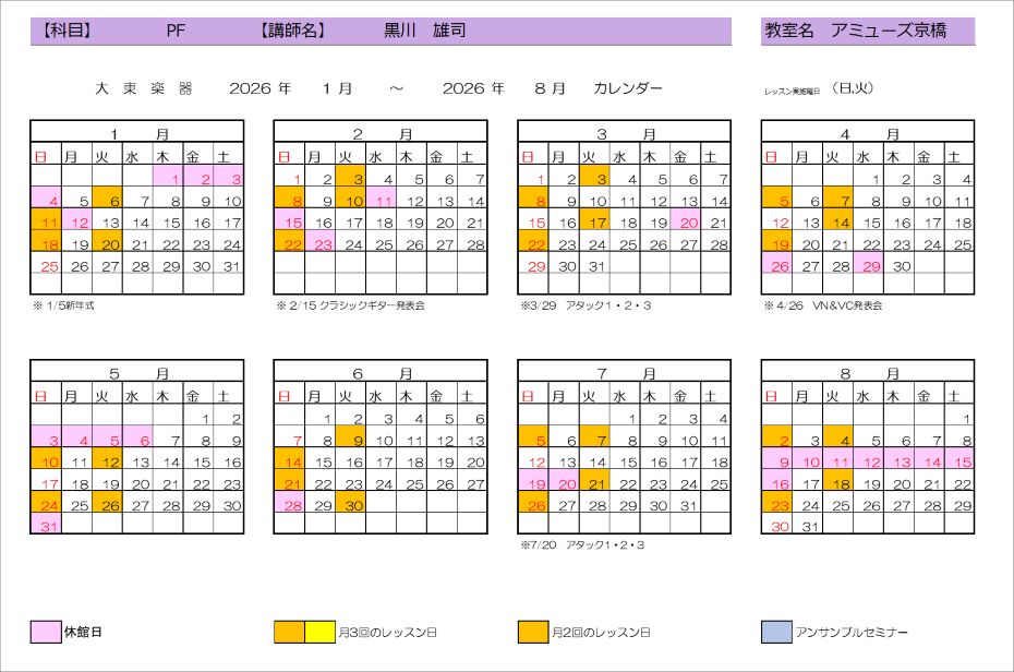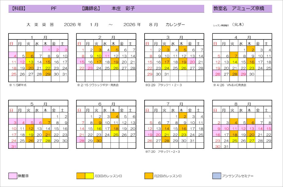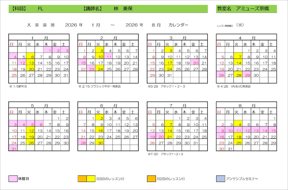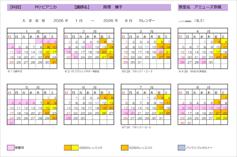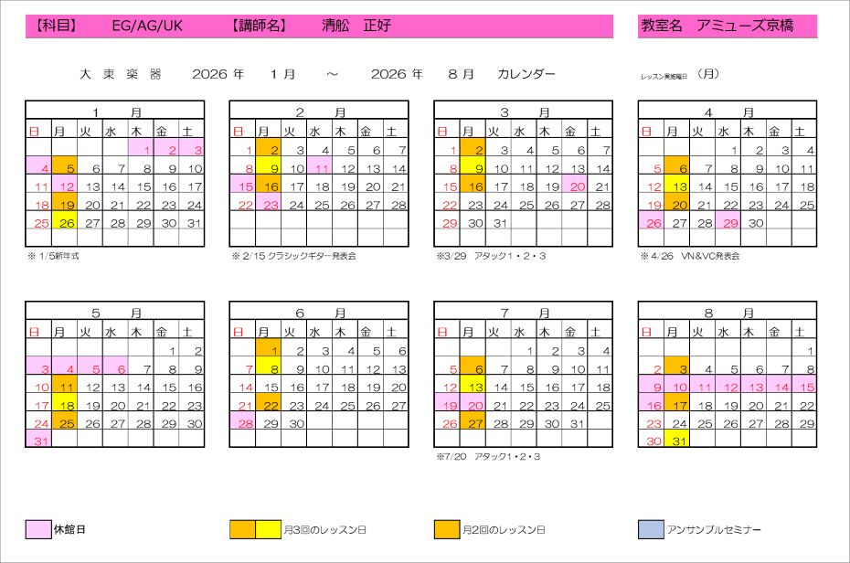 アミューズ京橋レッスン日程 2026年2月1日 アミューズ京橋 2026年1月~2026年8月までのレッスンスケジュールです。 更新日2026.2.1 ピアノ・キーボード・ピアニカ ボーカル・ゴスペル・ジャズボーカル ギター・ベース・ウクレレ ドラム バイオリン・チェロ サックス・アンサンブルセミナー トランペット・トロンボーン クラリネット・アンサンブルセミナー フルート・オカリナ・リコーダー ケーナ・フルートアンサブルセミナー 和楽器 その他 ピアノ・キーボード・ピアニカ 森本先生 (ピアノ:月・金) 仙波先生 (ピアノ・キーボード:月・水) 本庄先生 (ピアノ:火・木) 黒川先生 (ピアノ:火・日) 深田先生 (ピアノ・ピアニカ:月・水) 足立先生 (ピアノ:木) 貝塚先生 (ピアノ・ピアニカ:金・土) 平尾先生 (ピアノ:土) 岡本先生 (ピアノ:日) このページの上へ ボーカル・ゴスペル・ジャズボーカル 松田先生 (ボーカル:月) 飯嶋先生 (ボーカル:水・木・金・土) 蔵下先生 (ボーカル・ゴスペル:木・土) 岡本先生 (ボーカル:日) 佐川先生 (ジャズボーカル:月・土) このページの上へ ギター・ベース・ウクレレ 清舩先生 (ギター・ウクレレ:月) 島田先生 (ギター・ウクレレ:火) 苅田先生 (ギター・ウクレレ:火) 岡森先生 (ギター・ウクレレ:水・土) 北垣先生 (ギター・ウクレレ:木) 前田先生 (ギター・ウクレレ:日) 前田先生 (ギター・ウクレレ:木/1,3週) 前田先生 (ギター・ウクレレ:木/2,4週) 澤田先生 (ギター・ウクレレ:金) 清水先生 (ギター・ウクレレ:金) 川口先生 (ギター・ウクレレ:土) 飯田先生 (ギター・ウクレレ:日) 山田先生 (ベース・ウクレレ:金) 中村先生 (ベース・ウクレレ:日) このページの上へ ドラム 平見先生 (ドラム:月) 恩田先生 (ドラム:火) 塚本先生 (ドラム:火・木) 山口先生 (ドラム・ジュニアドラム:水・日) 坂東先生 (ドラム:水) 河上先生 (ドラム:木・土) 中山先生 (ドラム:金) このページの上へ バイオリン・チェロ 池田先生 (バイオリン:月) 冨山先生 (バイオリン:月・火) 佐藤先生 (バイオリン:火・水・木・金・土) 磯辺先生 (バイオリン:水) 八原先生 (バイオリン:日) 南口先生 (チェロ:月) 島田先生 (チェロ:木) 鍋谷先生 (チェロ:金・土) このページの上へ サックス・アンサンブルセミナー 後藤先生 (サックス:月・火・水・木・土) 後藤先生 (アンサンブルセミナー:水・金・日) 杉本先生 (サックス:月) 黒川先生 (サックス:火・水・金) 森先生 (サックス:木) 長澤先生 (サックス:金) 小川先生 (サックス:土) 坂戸先生 (サックス:日) 後藤先生 (EWI・ビックバンド:日) このページの上へ トランペット・トロンボーン・クラリネット・アンサンブルセミナー 木下先生 (トランペット:月・火) 谷先生 (トランペット:土) 矢部先生 (トロンボーン:水) 山内先生 (トロンボーン:木) 西畑先生 (クラリネット:火) 尾崎先生 (クラリネット・アンサンブルセミナー:木) 藤倉先生 (クラリネット:土) このページの上へ フルート・オカリナ・リコーダー・ケーナ・フルートアンサブルセミナー 大西先生 (フルート・オカリナ・アンサンブルセミナー:月・日) 大賀先生 (フルート:火) 林先生 (フルート:火) 板垣先生 (フルート・オカリナ・リコーダー・ケーナ:水・土) 中木先生 (フルート・オカリナ:水) 大石先生 (フルート:木) このページの上へ 和楽器 杵屋先生 (長唄三味線:火) 翔田先生 (津軽三味線:金・土) 伊藤先生 (お箏:金) このページの上へ その他 朴先生 (クラシックオルガン:月・水) 福山先生 (クラシックギター:月・金) 多武先生 (マンドリン:月) 塚脇先生 (二胡:水・土) 大田先生 (ヴィオリラ:金) 大和先生 (健康と音楽・青春ポップス:火・木・金) 芝田先生 (青春ポップス:月) 宮﨑先生 (うた声:火) このページの上へ お問い合わせ アミューズ京橋 TEL:06-6352-5576 E-mail:amuse@daito-gakki.co.jp