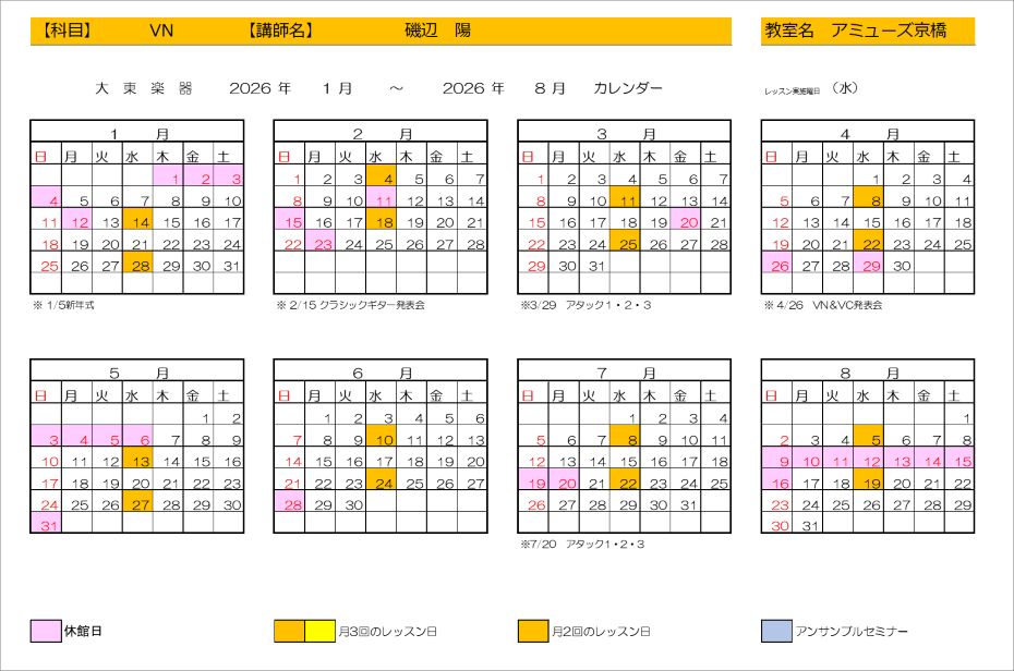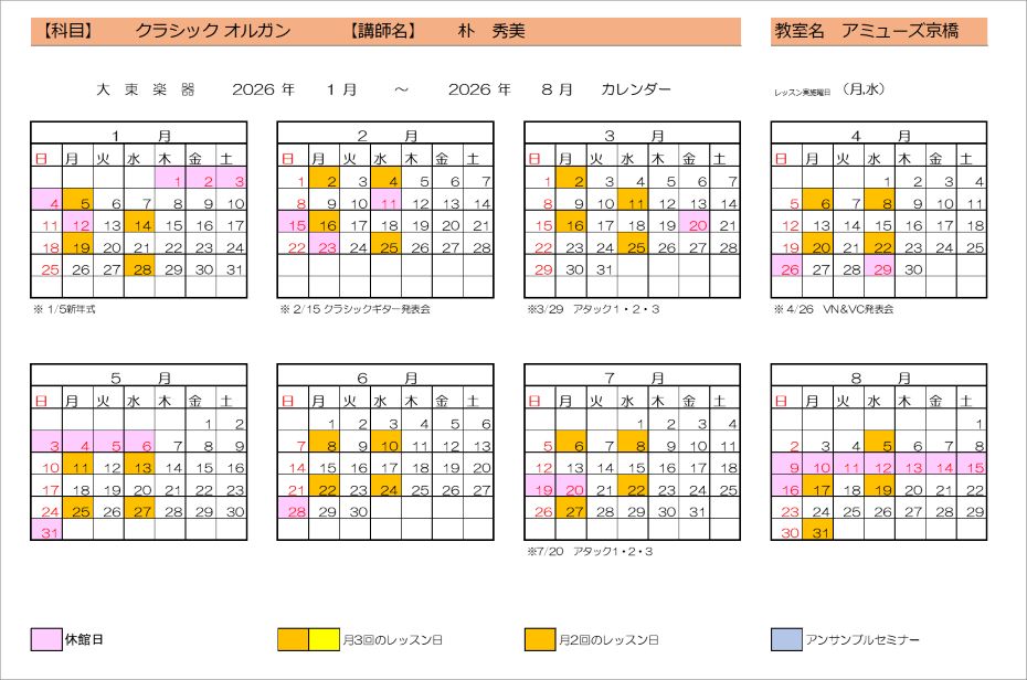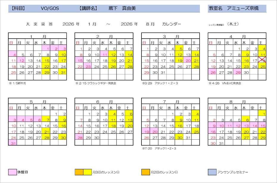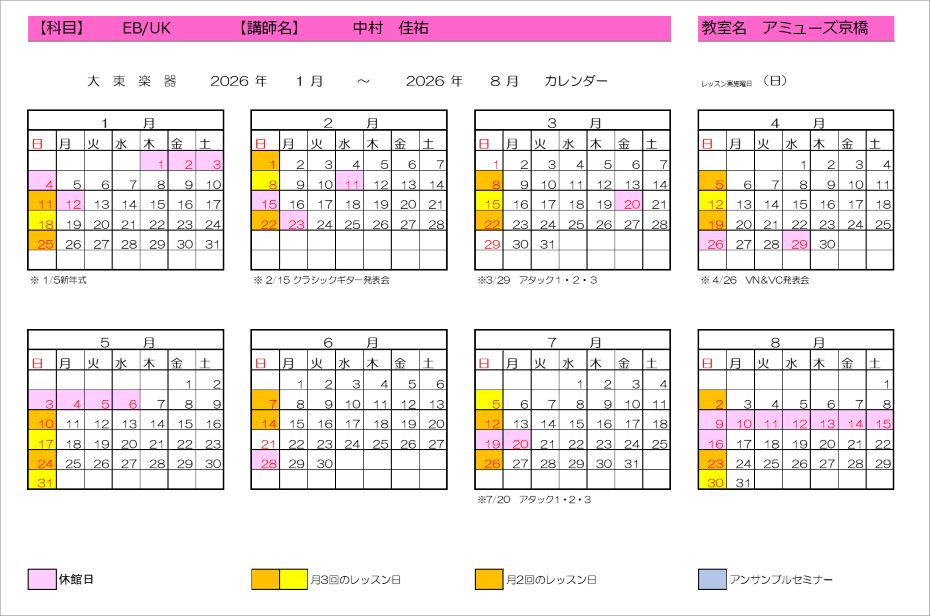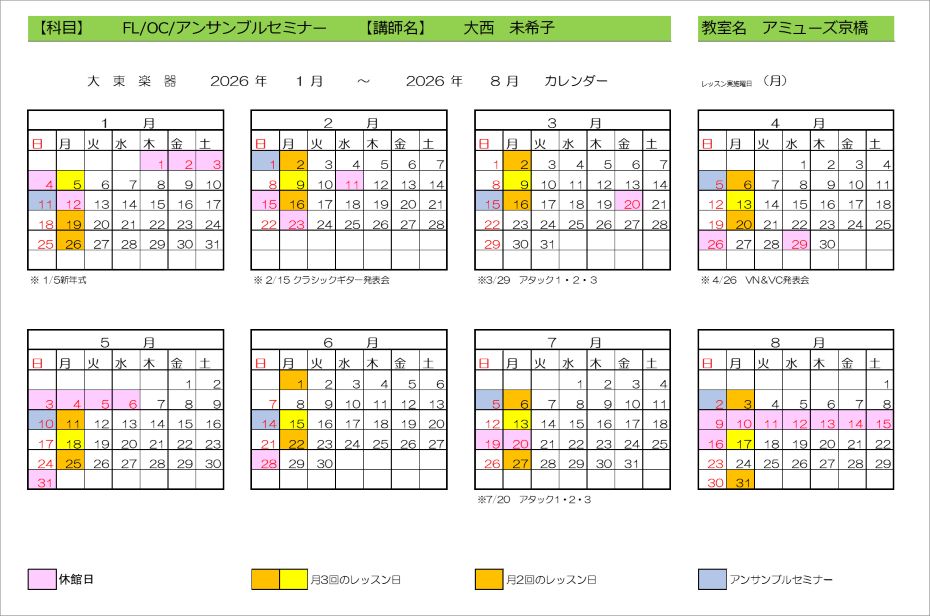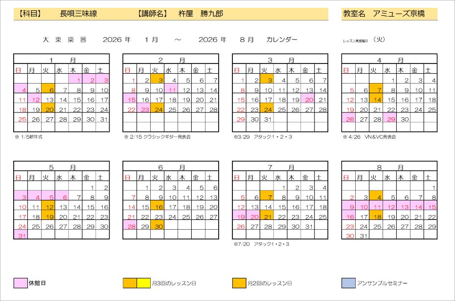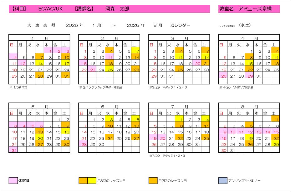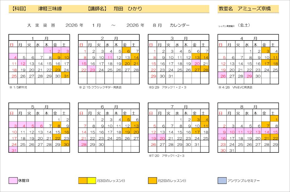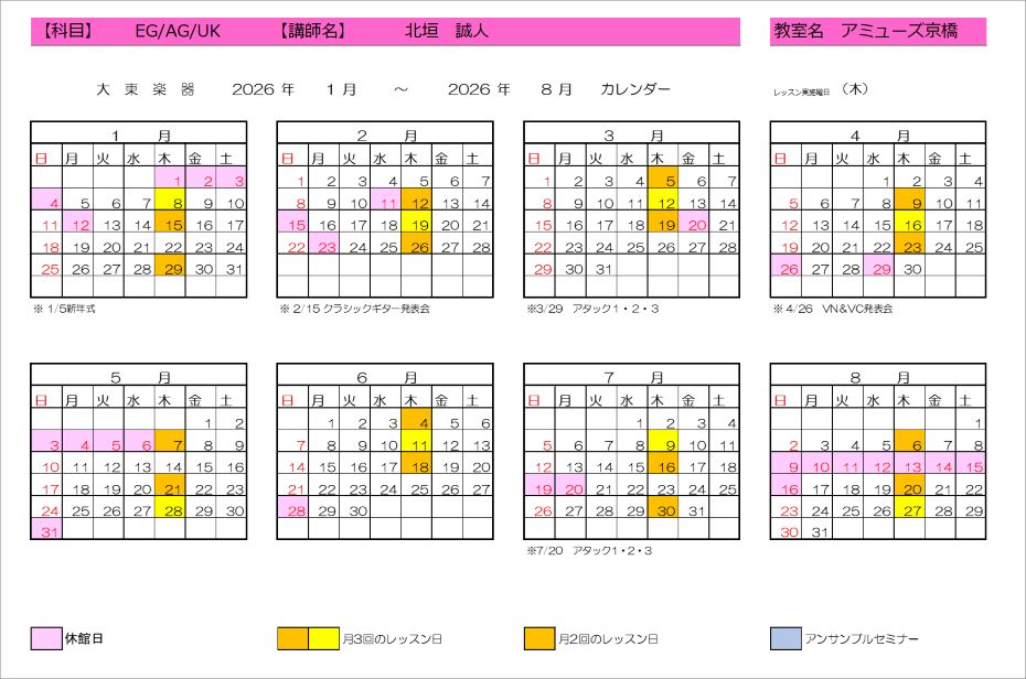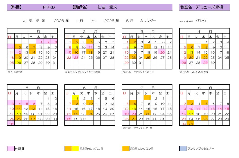 アミューズ京橋レッスン日程 2026年2月1日 アミューズ京橋 2026年1月~2026年8月までのレッスンスケジュールです。 更新日2026.2.1 ピアノ・キーボード・ピアニカ ボーカル・ゴスペル・ジャズボーカル ギター・ベース・ウクレレ ドラム バイオリン・チェロ サックス・アンサンブルセミナー トランペット・トロンボーン クラリネット・アンサンブルセミナー フルート・オカリナ・リコーダー ケーナ・フルートアンサブルセミナー 和楽器 その他 ピアノ・キーボード・ピアニカ 森本先生 (ピアノ:月・金) 仙波先生 (ピアノ・キーボード:月・水) 本庄先生 (ピアノ:火・木) 黒川先生 (ピアノ:火・日) 深田先生 (ピアノ・ピアニカ:月・水) 足立先生 (ピアノ:木) 貝塚先生 (ピアノ・ピアニカ:金・土) 平尾先生 (ピアノ:土) 岡本先生 (ピアノ:日) このページの上へ ボーカル・ゴスペル・ジャズボーカル 松田先生 (ボーカル:月) 飯嶋先生 (ボーカル:水・木・金・土) 蔵下先生 (ボーカル・ゴスペル:木・土) 岡本先生 (ボーカル:日) 佐川先生 (ジャズボーカル:月・土) このページの上へ ギター・ベース・ウクレレ 清舩先生 (ギター・ウクレレ:月) 島田先生 (ギター・ウクレレ:火) 苅田先生 (ギター・ウクレレ:火) 岡森先生 (ギター・ウクレレ:水・土) 北垣先生 (ギター・ウクレレ:木) 前田先生 (ギター・ウクレレ:日) 前田先生 (ギター・ウクレレ:木/1,3週) 前田先生 (ギター・ウクレレ:木/2,4週) 澤田先生 (ギター・ウクレレ:金) 清水先生 (ギター・ウクレレ:金) 川口先生 (ギター・ウクレレ:土) 飯田先生 (ギター・ウクレレ:日) 山田先生 (ベース・ウクレレ:金) 中村先生 (ベース・ウクレレ:日) このページの上へ ドラム 平見先生 (ドラム:月) 恩田先生 (ドラム:火) 塚本先生 (ドラム:火・木) 山口先生 (ドラム・ジュニアドラム:水・日) 坂東先生 (ドラム:水) 河上先生 (ドラム:木・土) 中山先生 (ドラム:金) このページの上へ バイオリン・チェロ 池田先生 (バイオリン:月) 冨山先生 (バイオリン:月・火) 佐藤先生 (バイオリン:火・水・木・金・土) 磯辺先生 (バイオリン:水) 八原先生 (バイオリン:日) 南口先生 (チェロ:月) 島田先生 (チェロ:木) 鍋谷先生 (チェロ:金・土) このページの上へ サックス・アンサンブルセミナー 後藤先生 (サックス:月・火・水・木・土) 後藤先生 (アンサンブルセミナー:水・金・日) 杉本先生 (サックス:月) 黒川先生 (サックス:火・水・金) 森先生 (サックス:木) 長澤先生 (サックス:金) 小川先生 (サックス:土) 坂戸先生 (サックス:日) 後藤先生 (EWI・ビックバンド:日) このページの上へ トランペット・トロンボーン・クラリネット・アンサンブルセミナー 木下先生 (トランペット:月・火) 谷先生 (トランペット:土) 矢部先生 (トロンボーン:水) 山内先生 (トロンボーン:木) 西畑先生 (クラリネット:火) 尾崎先生 (クラリネット・アンサンブルセミナー:木) 藤倉先生 (クラリネット:土) このページの上へ フルート・オカリナ・リコーダー・ケーナ・フルートアンサブルセミナー 大西先生 (フルート・オカリナ・アンサンブルセミナー:月・日) 大賀先生 (フルート:火) 林先生 (フルート:火) 板垣先生 (フルート・オカリナ・リコーダー・ケーナ:水・土) 中木先生 (フルート・オカリナ:水) 大石先生 (フルート:木) このページの上へ 和楽器 杵屋先生 (長唄三味線:火) 翔田先生 (津軽三味線:金・土) 伊藤先生 (お箏:金) このページの上へ その他 朴先生 (クラシックオルガン:月・水) 福山先生 (クラシックギター:月・金) 多武先生 (マンドリン:月) 塚脇先生 (二胡:水・土) 大田先生 (ヴィオリラ:金) 大和先生 (健康と音楽・青春ポップス:火・木・金) 芝田先生 (青春ポップス:月) 宮﨑先生 (うた声:火) このページの上へ お問い合わせ アミューズ京橋 TEL:06-6352-5576 E-mail:amuse@daito-gakki.co.jp