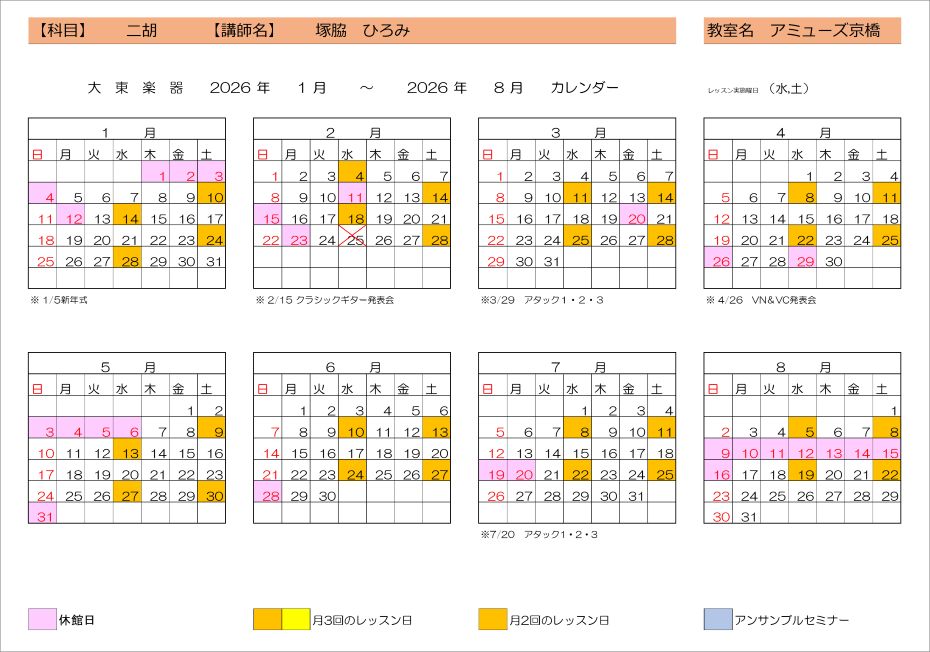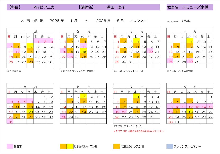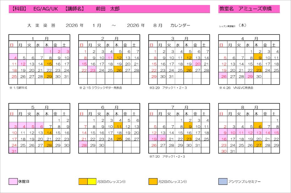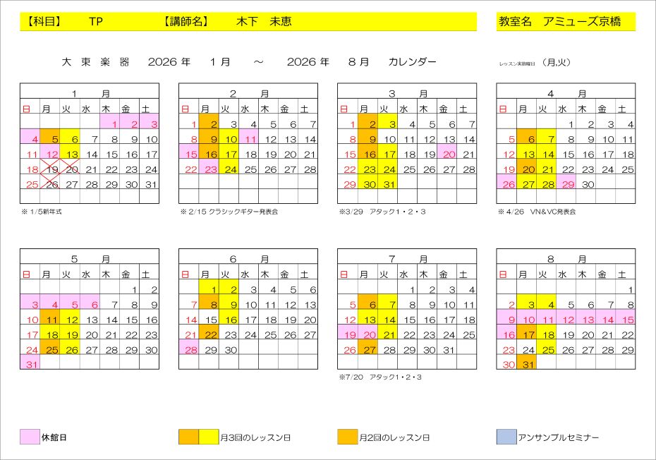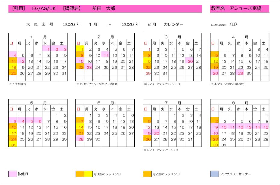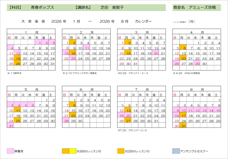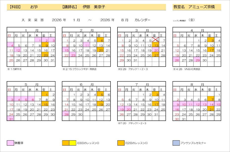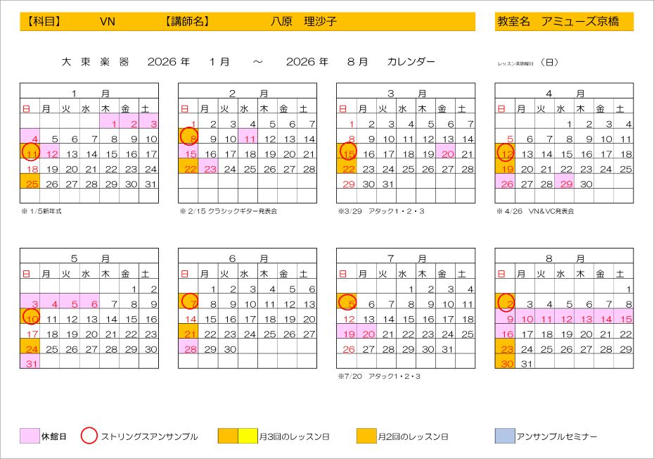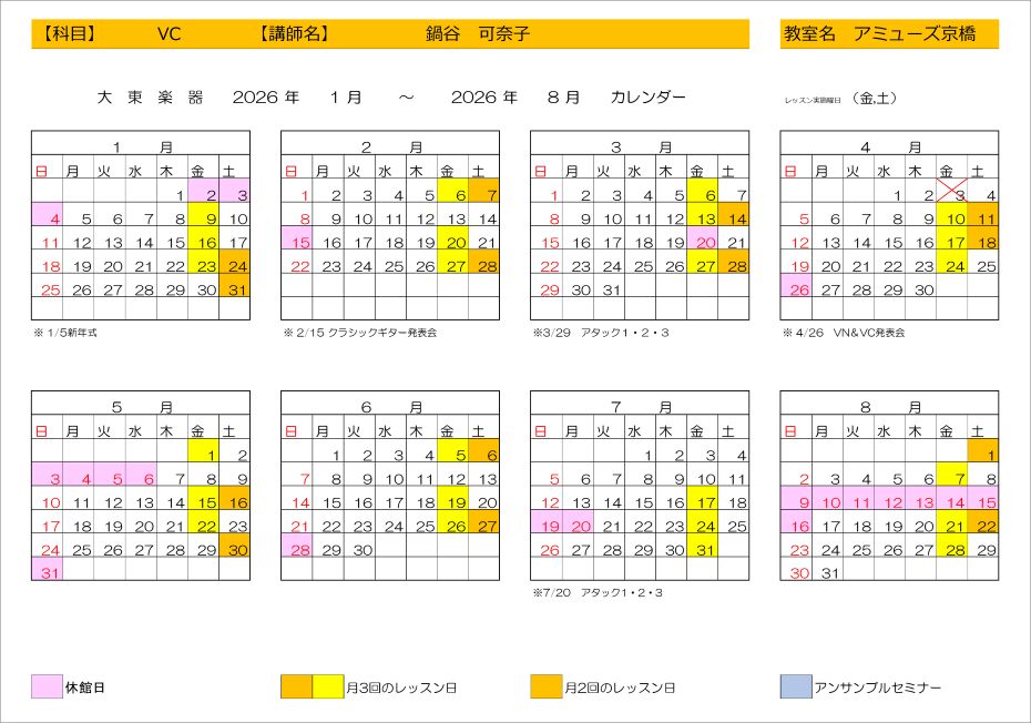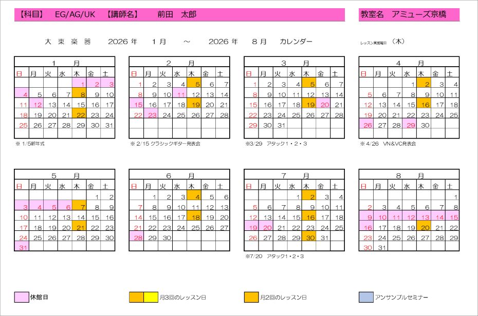 アミューズ京橋レッスン日程 2026年2月1日 アミューズ京橋 2026年1月~2026年8月までのレッスンスケジュールです。 更新日2026.2.1 ピアノ・キーボード・ピアニカ ボーカル・ゴスペル・ジャズボーカル ギター・ベース・ウクレレ ドラム バイオリン・チェロ サックス・アンサンブルセミナー トランペット・トロンボーン クラリネット・アンサンブルセミナー フルート・オカリナ・リコーダー ケーナ・フルートアンサブルセミナー 和楽器 その他 ピアノ・キーボード・ピアニカ 森本先生 (ピアノ:月・金) 仙波先生 (ピアノ・キーボード:月・水) 本庄先生 (ピアノ:火・木) 黒川先生 (ピアノ:火・日) 深田先生 (ピアノ・ピアニカ:月・水) 足立先生 (ピアノ:木) 貝塚先生 (ピアノ・ピアニカ:金・土) 平尾先生 (ピアノ:土) 岡本先生 (ピアノ:日) このページの上へ ボーカル・ゴスペル・ジャズボーカル 松田先生 (ボーカル:月) 飯嶋先生 (ボーカル:水・木・金・土) 蔵下先生 (ボーカル・ゴスペル:木・土) 岡本先生 (ボーカル:日) 佐川先生 (ジャズボーカル:月・土) このページの上へ ギター・ベース・ウクレレ 清舩先生 (ギター・ウクレレ:月) 島田先生 (ギター・ウクレレ:火) 苅田先生 (ギター・ウクレレ:火) 岡森先生 (ギター・ウクレレ:水・土) 北垣先生 (ギター・ウクレレ:木) 前田先生 (ギター・ウクレレ:日) 前田先生 (ギター・ウクレレ:木/1,3週) 前田先生 (ギター・ウクレレ:木/2,4週) 澤田先生 (ギター・ウクレレ:金) 清水先生 (ギター・ウクレレ:金) 川口先生 (ギター・ウクレレ:土) 飯田先生 (ギター・ウクレレ:日) 山田先生 (ベース・ウクレレ:金) 中村先生 (ベース・ウクレレ:日) このページの上へ ドラム 平見先生 (ドラム:月) 恩田先生 (ドラム:火) 塚本先生 (ドラム:火・木) 山口先生 (ドラム・ジュニアドラム:水・日) 坂東先生 (ドラム:水) 河上先生 (ドラム:木・土) 中山先生 (ドラム:金) このページの上へ バイオリン・チェロ 池田先生 (バイオリン:月) 冨山先生 (バイオリン:月・火) 佐藤先生 (バイオリン:火・水・木・金・土) 磯辺先生 (バイオリン:水) 八原先生 (バイオリン:日) 南口先生 (チェロ:月) 島田先生 (チェロ:木) 鍋谷先生 (チェロ:金・土) このページの上へ サックス・アンサンブルセミナー 後藤先生 (サックス:月・火・水・木・土) 後藤先生 (アンサンブルセミナー:水・金・日) 杉本先生 (サックス:月) 黒川先生 (サックス:火・水・金) 森先生 (サックス:木) 長澤先生 (サックス:金) 小川先生 (サックス:土) 坂戸先生 (サックス:日) 後藤先生 (EWI・ビックバンド:日) このページの上へ トランペット・トロンボーン・クラリネット・アンサンブルセミナー 木下先生 (トランペット:月・火) 谷先生 (トランペット:土) 矢部先生 (トロンボーン:水) 山内先生 (トロンボーン:木) 西畑先生 (クラリネット:火) 尾崎先生 (クラリネット・アンサンブルセミナー:木) 藤倉先生 (クラリネット:土) このページの上へ フルート・オカリナ・リコーダー・ケーナ・フルートアンサブルセミナー 大西先生 (フルート・オカリナ・アンサンブルセミナー:月・日) 大賀先生 (フルート:火) 林先生 (フルート:火) 板垣先生 (フルート・オカリナ・リコーダー・ケーナ:水・土) 中木先生 (フルート・オカリナ:水) 大石先生 (フルート:木) このページの上へ 和楽器 杵屋先生 (長唄三味線:火) 翔田先生 (津軽三味線:金・土) 伊藤先生 (お箏:金) このページの上へ その他 朴先生 (クラシックオルガン:月・水) 福山先生 (クラシックギター:月・金) 多武先生 (マンドリン:月) 塚脇先生 (二胡:水・土) 大田先生 (ヴィオリラ:金) 大和先生 (健康と音楽・青春ポップス:火・木・金) 芝田先生 (青春ポップス:月) 宮﨑先生 (うた声:火) このページの上へ お問い合わせ アミューズ京橋 TEL:06-6352-5576 E-mail:amuse@daito-gakki.co.jp