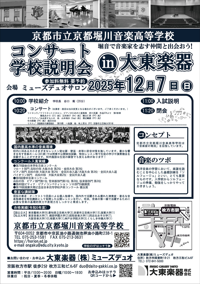 12/7(日) 京都市立京都堀川音楽高等学校 コンサート・学校説明会 in 大東楽器 2025年9月20日 ミューズデュオ、大東楽器音楽院 Web申し込み お問い合わせ・お申し込み ミューズデュオ TEL:072-841-5000 E-mail:duo@daito-gakki.co.jp